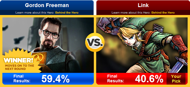 Après une chaude lutte, notre héros tout de vert vêtu s'incline face à ce personnage à lunettes que je n'apprécie pas, Gordon Freeman. Je regardais régulièrement les résultats du sondage qui ne cessait de changer de jour en jour. Les gens ont tranché. Pas plus tard qu'hier, Link était à égalité avec son nouveau rival de l'heure, cependant il a clairement chuté dans les sondages, une baisse de 9,4%, contre une hausse de 9,4% également pour Freeman. Public en délire (ou pas) : BOOUH ! C'EST NUL ! On voulait Link ! Gordon, il est pas beau ! Ses lunettes sont nazes ! Son costume est laid !