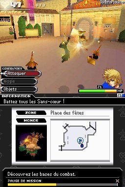 Cette image pourrait, en gros, résumer le jeu aux non-fans de la série : si l'on ne pourrait citer que un seul gros défaut de Kingdom Hearts 358/2 Days, c'est bien sa répétitivité. Les missions sont toujours les mêmes : buter tel ou tel sans-coeur. Bien sûr, on a quelques nouveautés comme chercher des emblèmes qui ne servent à rien mais bon, ça change un peu et ça fait du bien, chercher des indices qui n'en sont pas vraiment mais bon, ça change un peu et ça fait du bien, ou bien des missions "d'espionnage" qui elles, par-contre, sont vraiment inutiles et ne font que nous casser le plaisir de jeu. Le soft n'est pas aussi magique que les autres opus, on a moins de dialogues avec les personnages Disney, on ne sauve pas la vie de Mulan ou de Jack Sparrow, on ne fait que suivre les journées banales de Roxas au sein de l'organisation des encapuchonnés noirs. Mais malgré tout, le jeu est loin d'être décevant et recèle bon nombre de qualités, surtout si on est fan de la série.