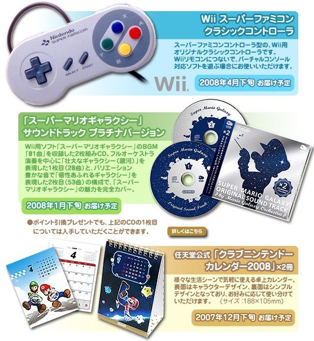Il sera bientôt possible d'acheter via le Club Nintendo japonais, une manette Super nintendo compatible avec la Wii pour jouer aux titres de la console virtuelle. Une info qui fait mal au bide, d'autant que d'autres goodies intéressants sont proposés, comme l'OST de Super Mario Galaxy en version Platinum (2 CD) ou le calendrier Nintendo.