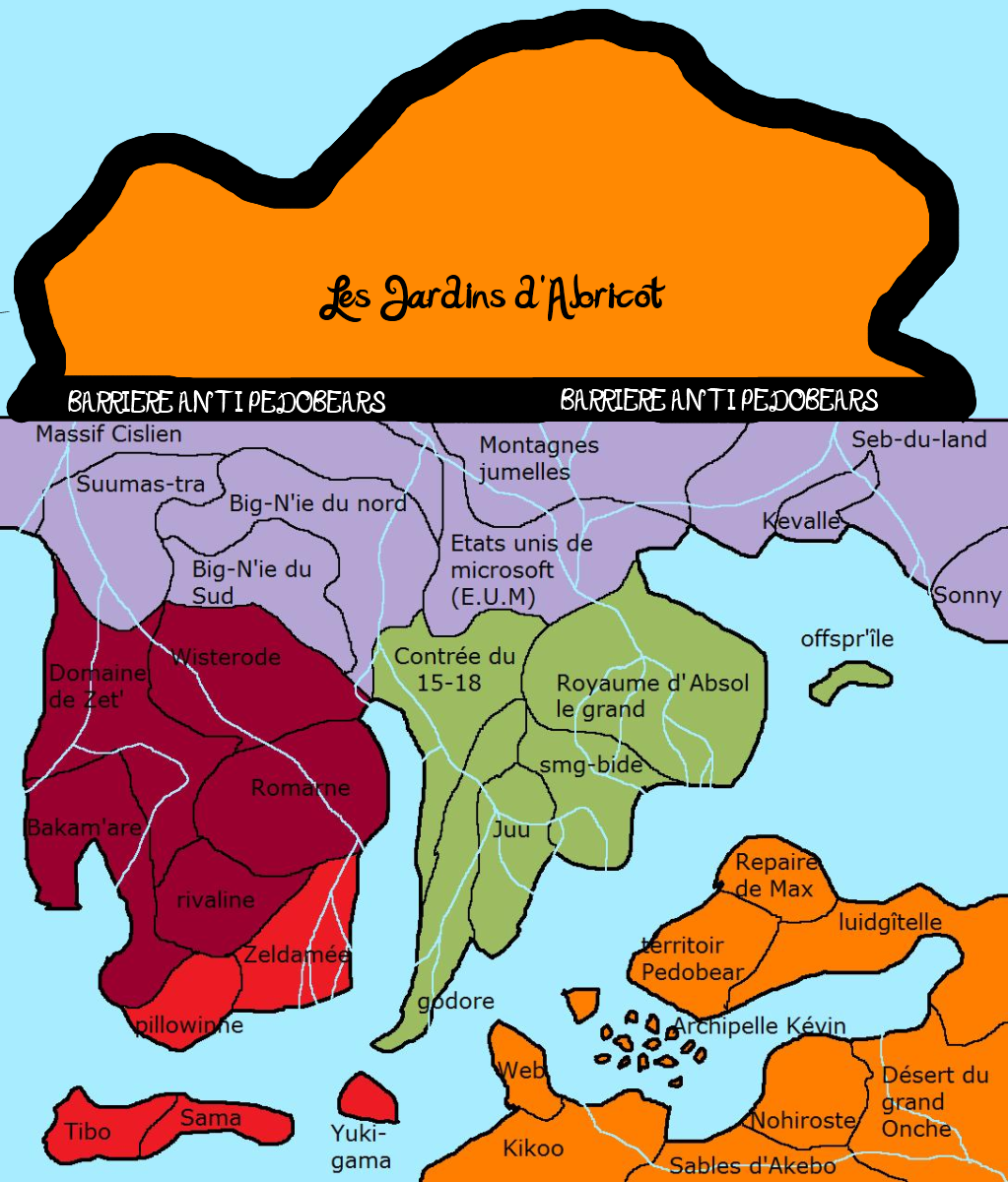 Vous évoluerez sur une planète appelée Jaw-Vidéaw ( :noelol: ). Elle sera composée de 5 continents n'ayant pas vraiment de nom mais qui se distinguent les uns des autres grâce à différents critères (climat, politique générale, économie, faune,...). Chacun de ces continents est divisé en quelques pays sur lesquelles règnent des rois, des présidents ou encore des dictateurs. L'univers n'est pas moderne et se rapproche de l'époque médiévale, à mi-chemin entre un Zelda, un Dragon Quest et un Monster Hunter. Pour vous faire une idée, regardez la carte ci-dessous: