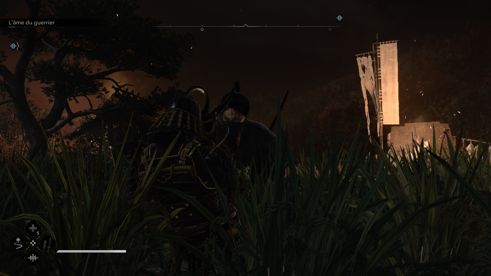 Ainsi Naoe s'axe clairement sur une infiltration qui a été quelque peu améliorée. En effet, la nuit, se dissimuler dans les ombres vous donne un avantage certain (alors que de jour, vous vous seriez fait repérer sans mal). Ces nuances apportent plus de finesse au gameplay. Ses arbres de talents permettent d’améliorer la maîtrise de ses armes comme le Katana ou le Tanto. Mais aussi ses techniques d’assassinat et d’utilisations des outils (fumigènes, Kunaï…). A titre d’exemple, il est possible d’assassiner un ennemi au travers d’une porte avec le Katana ou de loin avec un Kusarigama grâce à sa chaîne en se propulsant sur sa cible. Il est évident qu’il est très plaisant de jouer avec elle tant on arrive à éliminer ses ennemis avec efficacité d’autant plus qu’elle possède une concentration (comme la vision d'aigle).