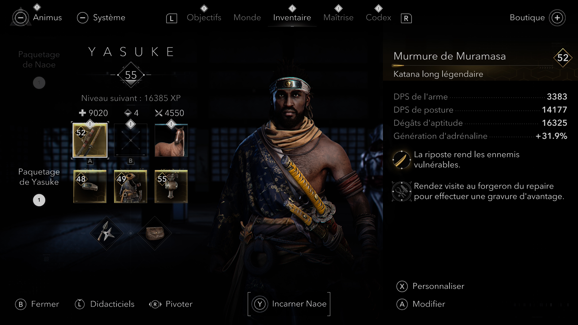 Shadow apporte une nuance plutôt bonne, c’est le fait que les deux protagonistes se jouent clairement différemment. En effet, même si par le passé Ubisoft avait tenté cette expérience avec Evie et Jacob dans Syndicate, les différences étaient au final très peu significatives pour sentir deux gameplays distincts. Ici en revanche, c’est une Naoe incroyablement habile et très portée sur l’infiltration, l’assasinat furtif mais étant frêle au combat face à un Yasuke très lourd, imposant, ne disposant ni d’agilité, ni de discrétion mais à la force permettant de tenir tête à de nombreuses troupes. Par exemple, Naoe peut grimper presque partout, elle peut évoluer en mode parcours avec une aisance folle, elle dispose aussi d’un grappin lui permettant d’accéder à des hauteurs insoupçonnées.