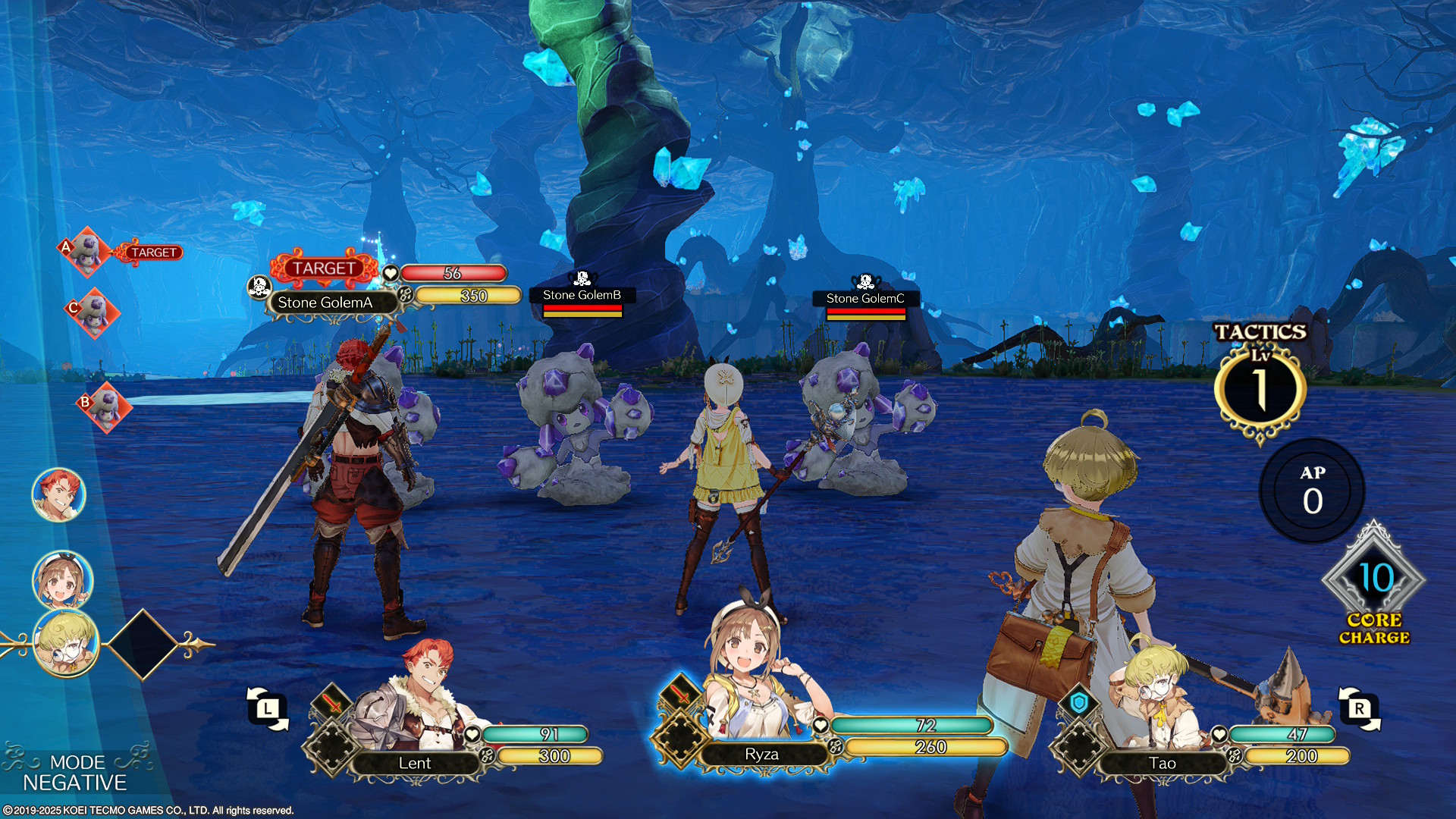 Mais attention : sous leurs airs idylliques, ces décors peuvent se révéler dangereux. Les zones sont peuplées de créatures parfois redoutables, l’occasion de s’essayer à un système de combat qui se démarque des habituels tour-par-tour figés. Inspiré d’un mélange entre Grandia et le système ATB de Final Fantasy, le combat repose sur une gestion du temps d’action : chaque personnage doit attendre que sa jauge soit pleine avant d’agir (attaque, compétence, objet, etc.). La subtilité vient de la jauge d’AP partagée entre les membres de l’équipe, qui se remplit à mesure que l’on attaque. Ces points servent à lancer des compétences ou à augmenter le niveau tactique du groupe, permettant ainsi d’enchaîner des enchaînements de plus en plus conséquents.