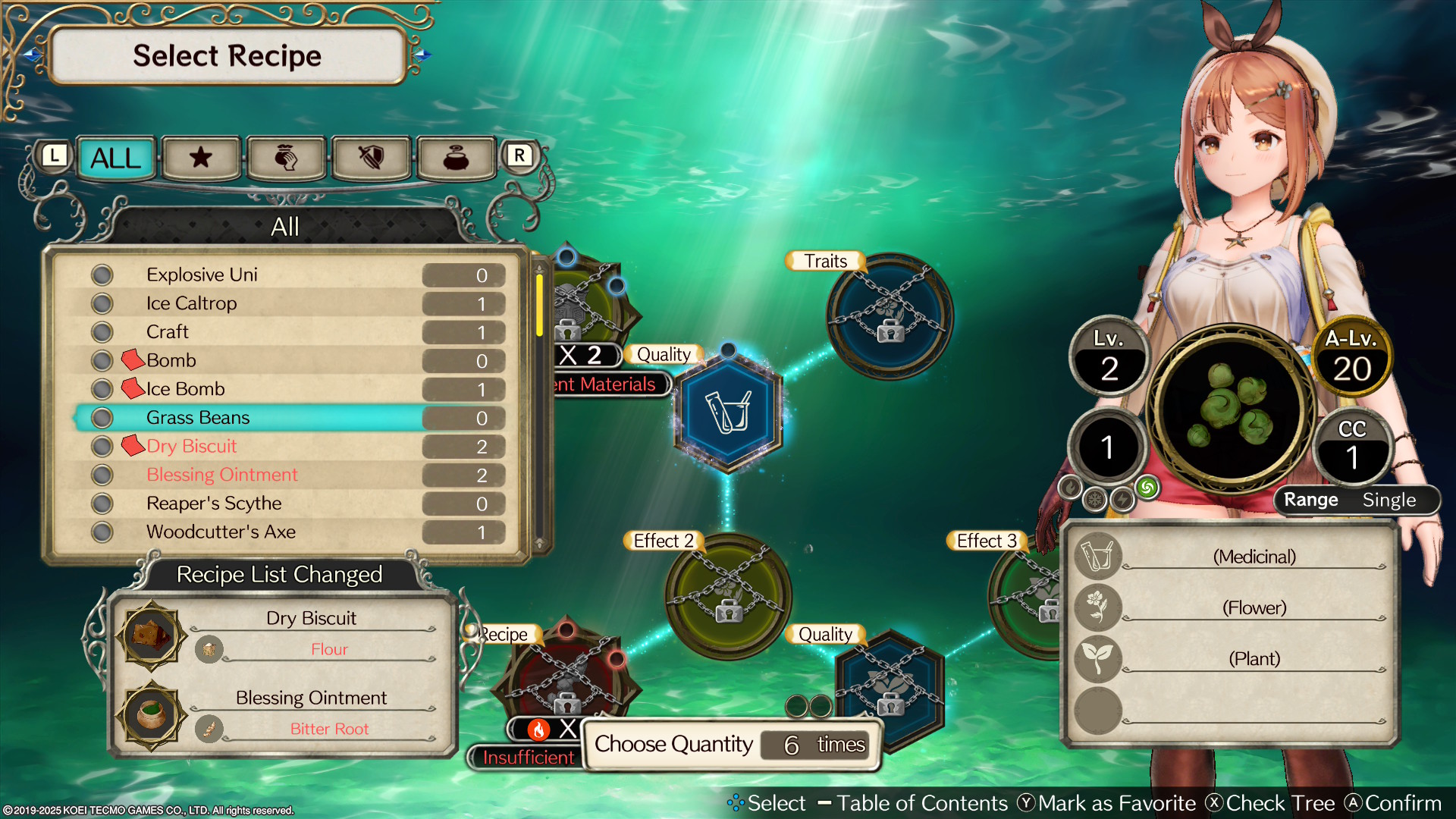 Ryza, en tant qu’alchimiste, peut créer toutes sortes d’objets: des matériaux de construction aux armes et équipements. Pour cela, elle utilise un système de recettes prenant la forme d’un arbre de compétences, où chaque case représente un ingrédient ou un effet possible. Il faut y placer les bons éléments pour réussir la synthèse, tout en ajoutant des ingrédients optionnels afin de débloquer de nouvelles propriétés ou branches de création. Le nombre d’actions étant limité, l’objectif est de produire la meilleure combinaison possible en optimisant le coût et la qualité des ressources. Les propriétés obtenues peuvent aller d’un bonus élémentaire à une augmentation du prix de revient