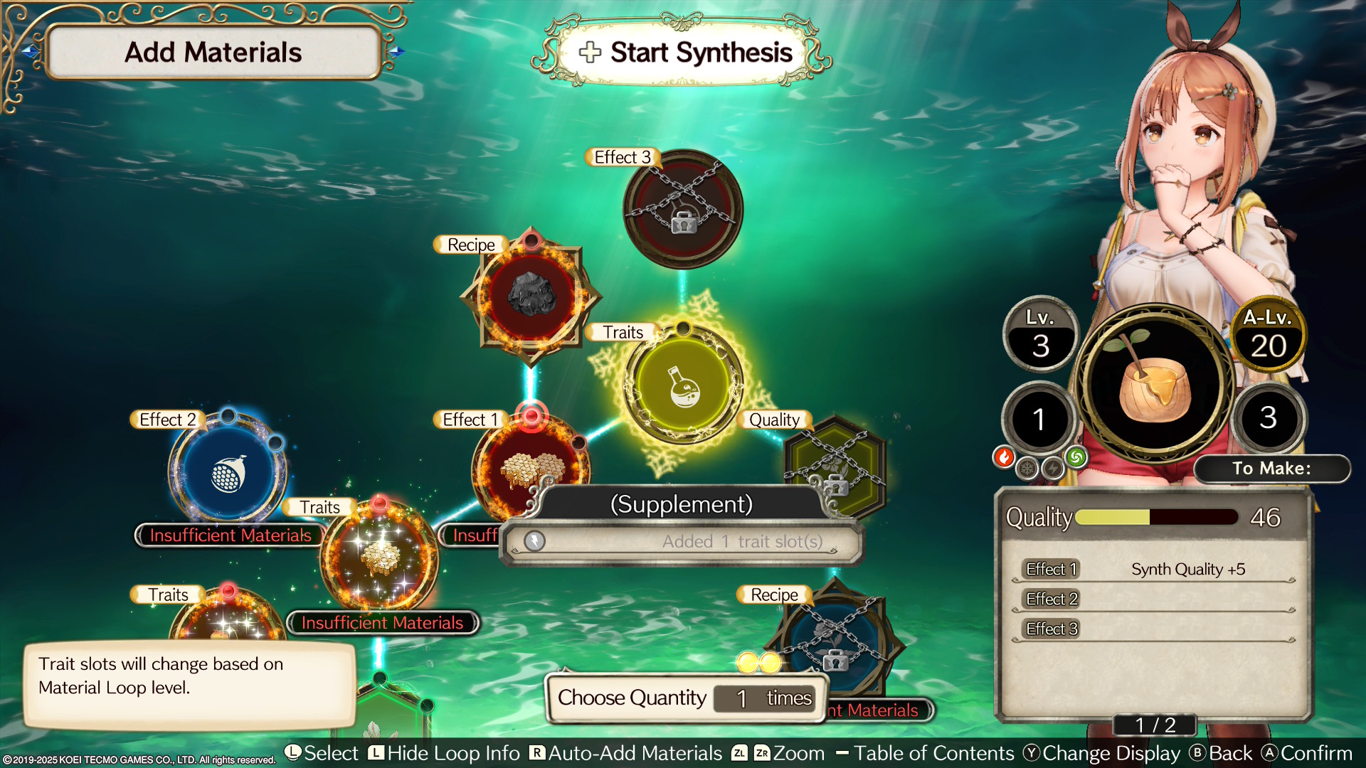 Il est possible d’améliorer la qualité des synthèses, afin d’en renforcer les effets et d’obtenir des propriétés supplémentaires. Les recettes, quant à elles, se débloquent progressivement au fil de l’aventure, mais aussi en réussissant certaines combinaisons, ou en faisant monter le niveau d’alchimie de Ryza — un niveau qui augmente tout simplement en pratiquant la synthèse.
