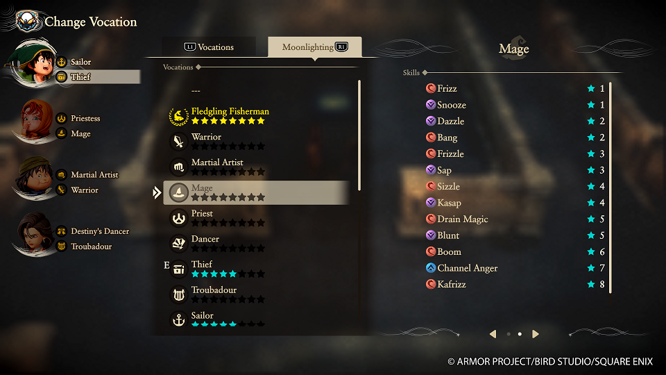 En plus du lifting habituel sur un remake, les développeurs ont prévu quelques nouveautés pour soit améliorer le confort de jeu, soit ajouter de nouvelles idées qui permettront de voir le jeu autrement. On peut citer trois petits ajouts de confort, à savoir la possibilité de se déplacer plus rapidement sur la carte, impliquant aussi une forme de combat automatique : si vous êtes bien plus fort que le monstre que vous croisez, le combat sera vaincu d’office afin de gagner du temps. Il vous sera aussi possible de modifier en temps réel la vitesse de déroulement d’un combat, vous permettant notamment d’activer les combats ultra rapides qui jouent presque le jeu à votre place, pour les plus pressés. Mais les deux très grandes nouveautés qui nous ont été dévoilées concernent les vocations : comme évoqué un peu plus tôt, ce remake proposera d’affecter deux vocations à chaque personnage, permettant ainsi d’avoir les avantages, les sorts et aptitudes des deux vocations en même temps. Enfin, une nouvelle mécanique opérera lors des combats : les vocations de chaque personnage pourront débloquer la Frénésie Combative. Cela se présente comme une compétence spéciale liée au personnage et qui agit comme une action, avec des effets souvent très intéressants.