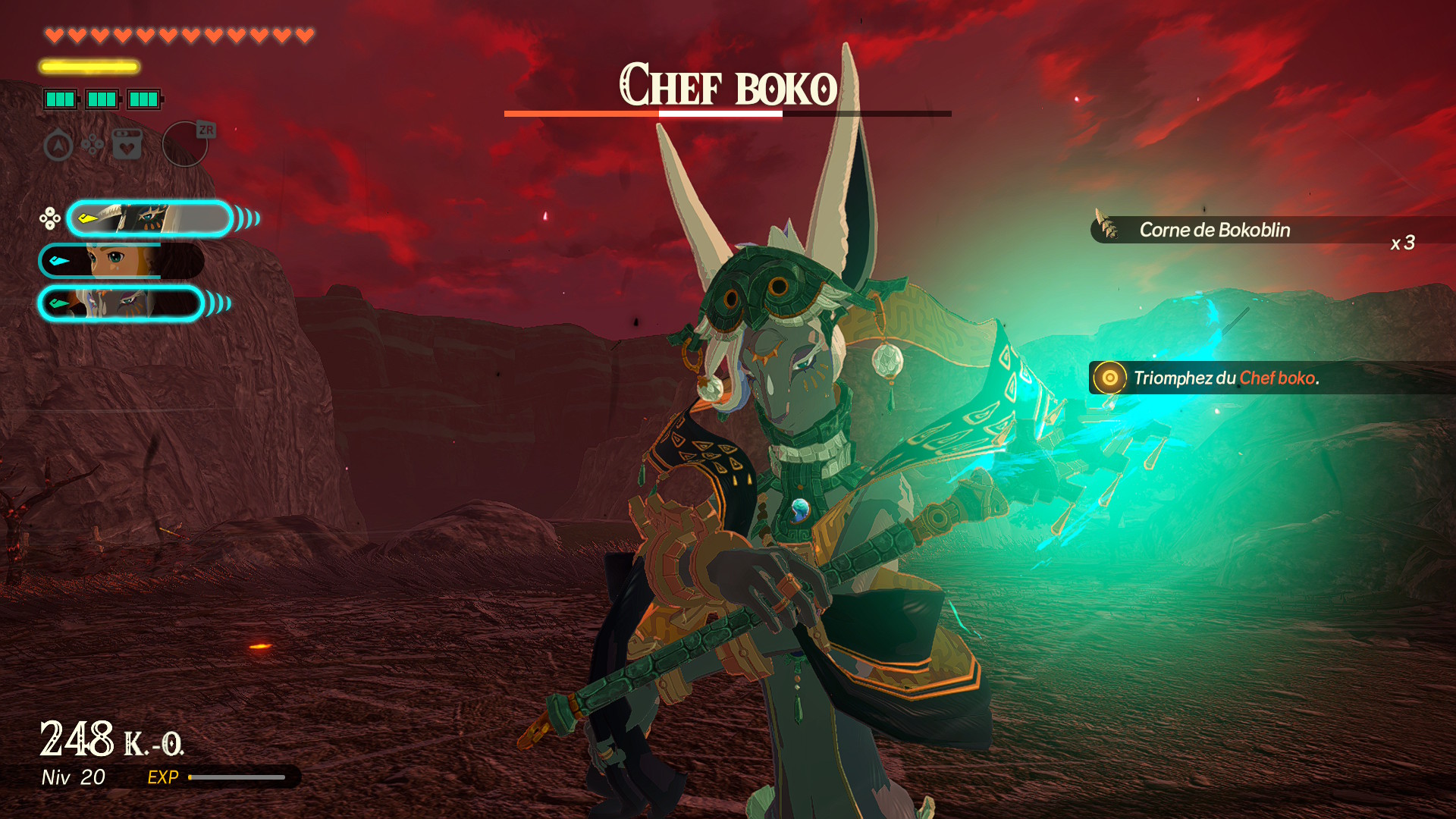 Et c’est là qu’intervient la jauge de point faible des ennemis « principaux » et boss. En général, cette jauge apparaît à certains moments, lorsqu’un Moblin finit son combo ou sa charge. La vider est donc un avantage certain afin de déclencher un coup puissant et d’infliger de très lourds dégâts. Il est aussi possible de la faire apparaître en lançant un coup fatal, une fois la jauge dédiée pleine (coup Musou pour ceux préférant le nom d’origine du genre). Enfin, une autre des grandes nouveautés, ce sont les coups duo. En effet, en combattant côte à côte durant une bataille, les personnages remplissent une jauge duo. Une fois que deux personnages sont prêts, vous pouvez la lancer. Souvent impressionnante, elle inflige à la fois des dégâts et entame la jauge de point faible avec efficacité. Mais ça ne s’arrête pas là : ce que fait le personnage dépend de s’il est attaquant principal (celui que vous contrôlez) ou secondaire. Certains, en secondaires, renforcent leur partenaire, leur donnant alors un pouvoir élémentaire, par exemple (plus efficace qu’on ne pourrait le croire).