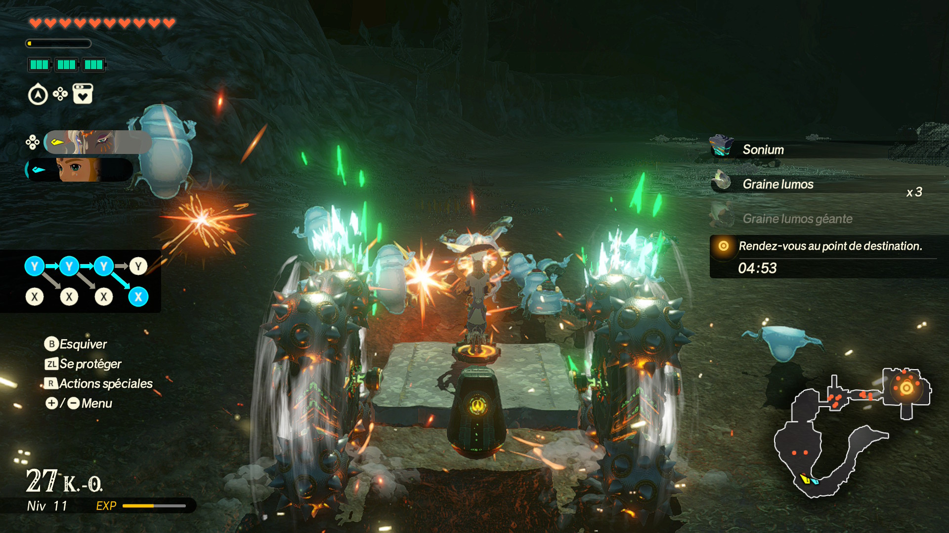 Outre les combos, chaque personnage possède des techniques personnelles. Celles-ci permettent surtout de contrer les attaques puissantes de vos ennemis, attaques visibles par le halo rouge autour de l’adversaire. Ces contres, à la fois dynamiques et puissants, offrent plus de nervosité au gameplay (bien plus que l’ancienne tablette Sheikah, par exemple). De ce fait, le gameplay nous a semblé plus fluide et plaisant. Une autre mécanique vient s’ajouter : les artefacts soneaux. Vous allez, par exemple, débloquer le lance-flammes. Il est alors possible de s’en servir par un menu raccourci, au même titre que les techniques personnelles. Ainsi, enflammer un ennemi peut vraiment aider. En effet, exploiter les faiblesses élémentaires peut vite devenir d’une efficacité foudroyante, pour ainsi dire. Il est même possible de profiter de l’eau pour intensifier l’effet du gel ou de la foudre. Il est aussi possible de cuisiner afin de gagner quelques bonus en combat (expérience, remplissage de jauge etc.).