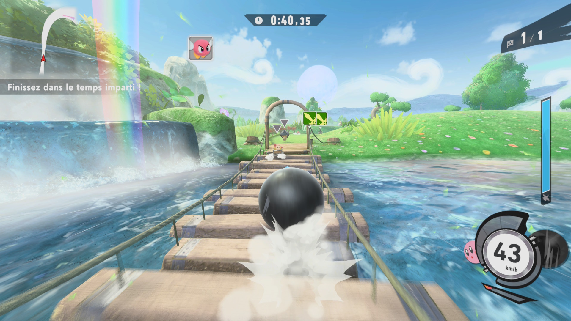 Sans surprise, le jeu tourne parfaitement sur Nintendo Switch 2. Framerate stable, animations soignées, lisibilité constante et aucune chute visible. La sensation de vitesse est bien rendue et certains effets donnent même une vraie impression de puissance. Pour autant, ce n’est pas un jeu vitrine. Il n’essaie jamais d’impressionner. Le style Kirby, avec ses couleurs franches et sa douceur visuelle reste fidèle à lui-même. C’est agréable, charmant, parfois très beau, mais jamais spectaculaire. En portable comme en mode TV, la qualité reste identique, il n'y a pas de compromis visible, simplement une direction artistique qui ne vise pas les sommets techniques. La musique suit la tradition Kirby : dynamique, joyeuse, énergique, parfois un peu redondante mais jamais pénible. On est clairement du côté de Smash Bros dans l’approche, avec des compositions calibrées pour accompagner l’action sans la dominer. Les bruitages, eux, sont efficaces et lisibles. Le jeu n’essaie pas de proposer une ambiance sonore riche ou immersive : il sert le gameplay, et c’est tout. Tout cela, et notamment les bruitages, rappellera aux nostalgiques de Super Smash Bros. l’univers sonore de la série, en attendant le prochain épisode.