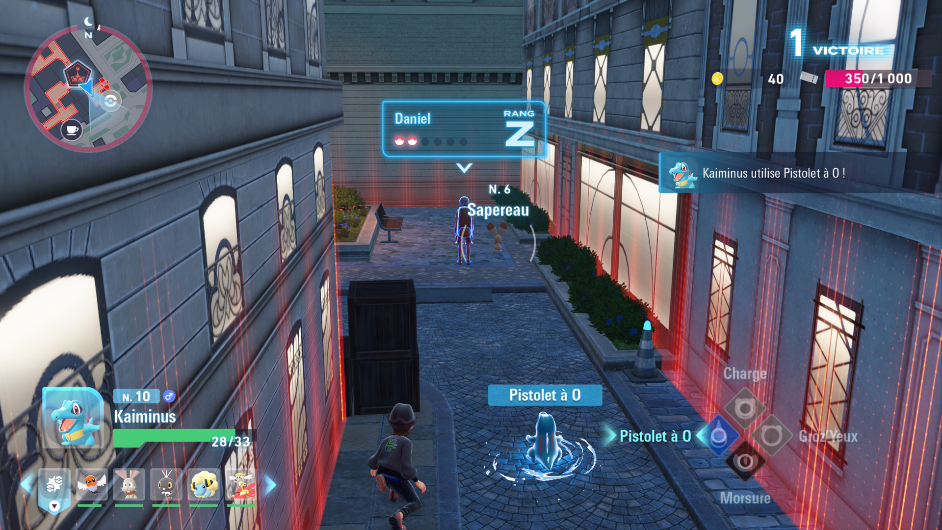 Une fois dans la zone de combat, vous verrez des dresseurs déambuler avec un Pokémon. Vous aurez le choix entre les rencontrer de front, ou attaquer dans le dos le Pokémon adverse pour commencer le combat avec une avance intéressante. Le but est simple : éliminer les Pokémon de l’adversaire. Ce faisant, vous obtiendrez des points, qui pourront être échangés à un palier précis contre un ticket de défi, et des médailles qui, une fois le jour levé, seront converties en pokédollars. Votre objectif est simple : affronter un maximum de dresseurs pour obtenir votre ticket, et ensuite affronter un dresseur spécifique lors d’un combat de rang. En battant votre adversaire, vous passerez au rang supérieur.