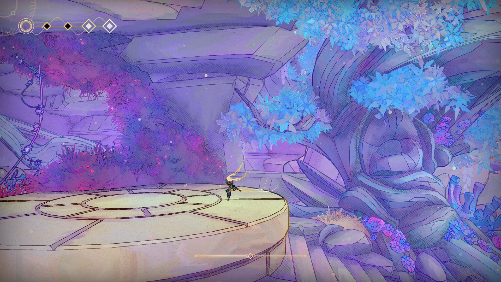 MIO porte sans honte la marque de ses illustres inspiration : l’histoire cryptique, ainsi que le level design travaillé de Dark Souls, l’exploration et la progression des meilleurs Metroid, et bien entendu, des ajouts qui lui sont propres. C’est un mélange immédiatement familier, mais qui réussit à surprendre grâce à quelques parti pris audacieux. Par exemple, les checkpoints sont peu nombreux, et c’est surtout en débloquant des raccourcis que vous allez vous épargner des aller-retour. Le monde paraît austère, mais c’est votre exploration qui va dénicher de nouveaux marchands et alliés qui vont vous rejoindre.