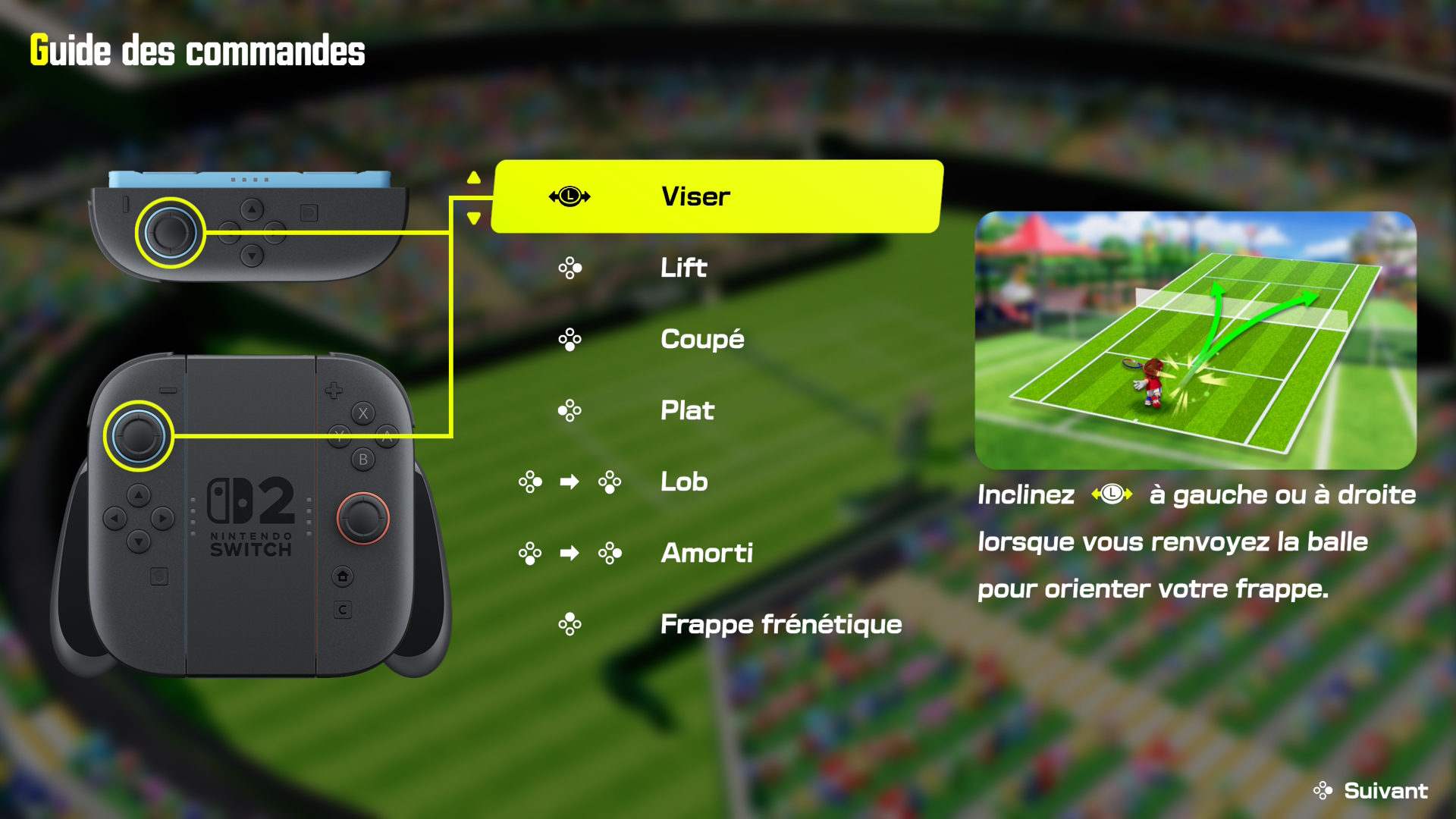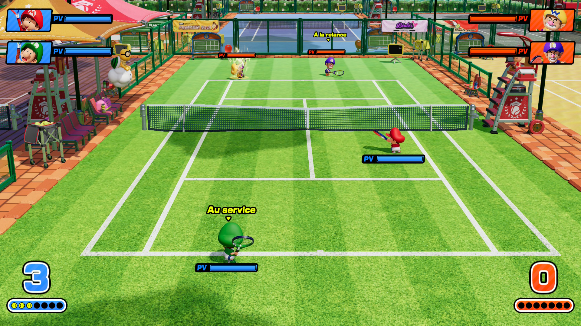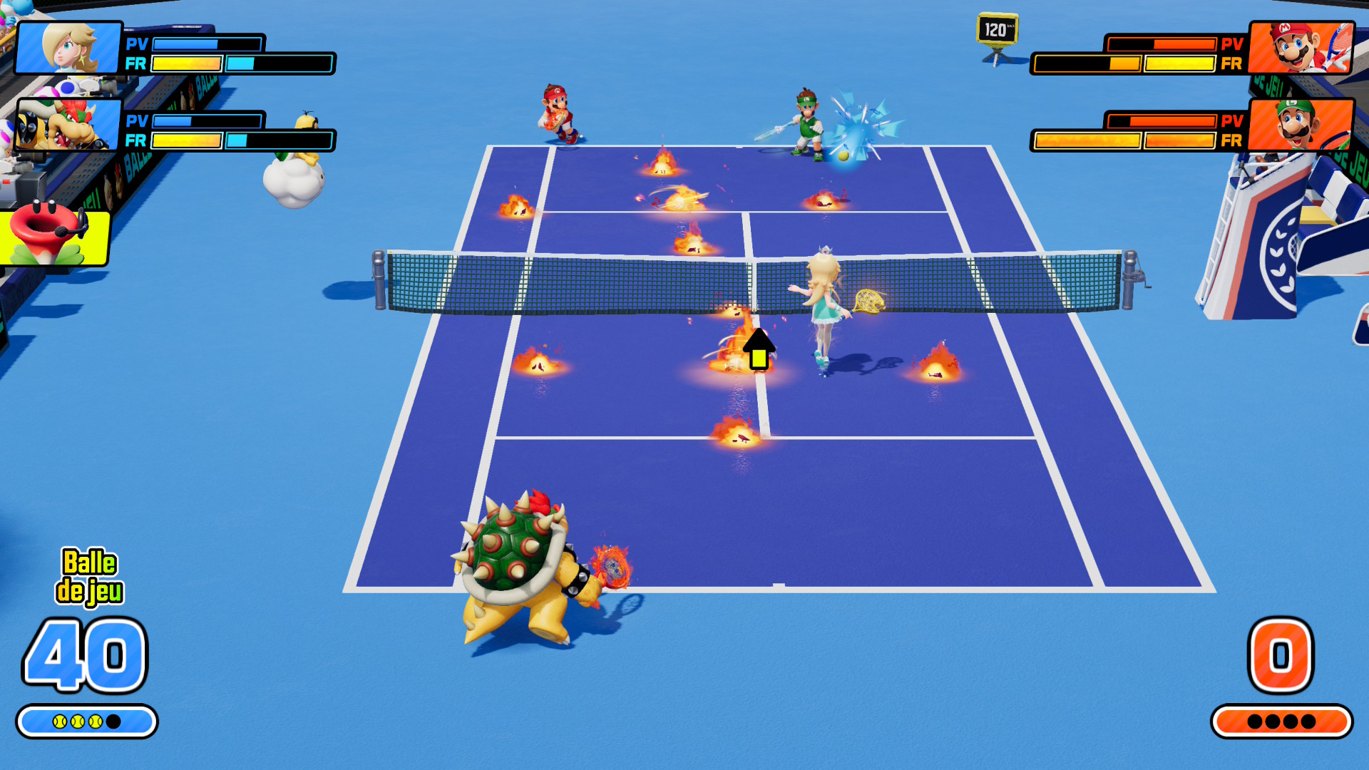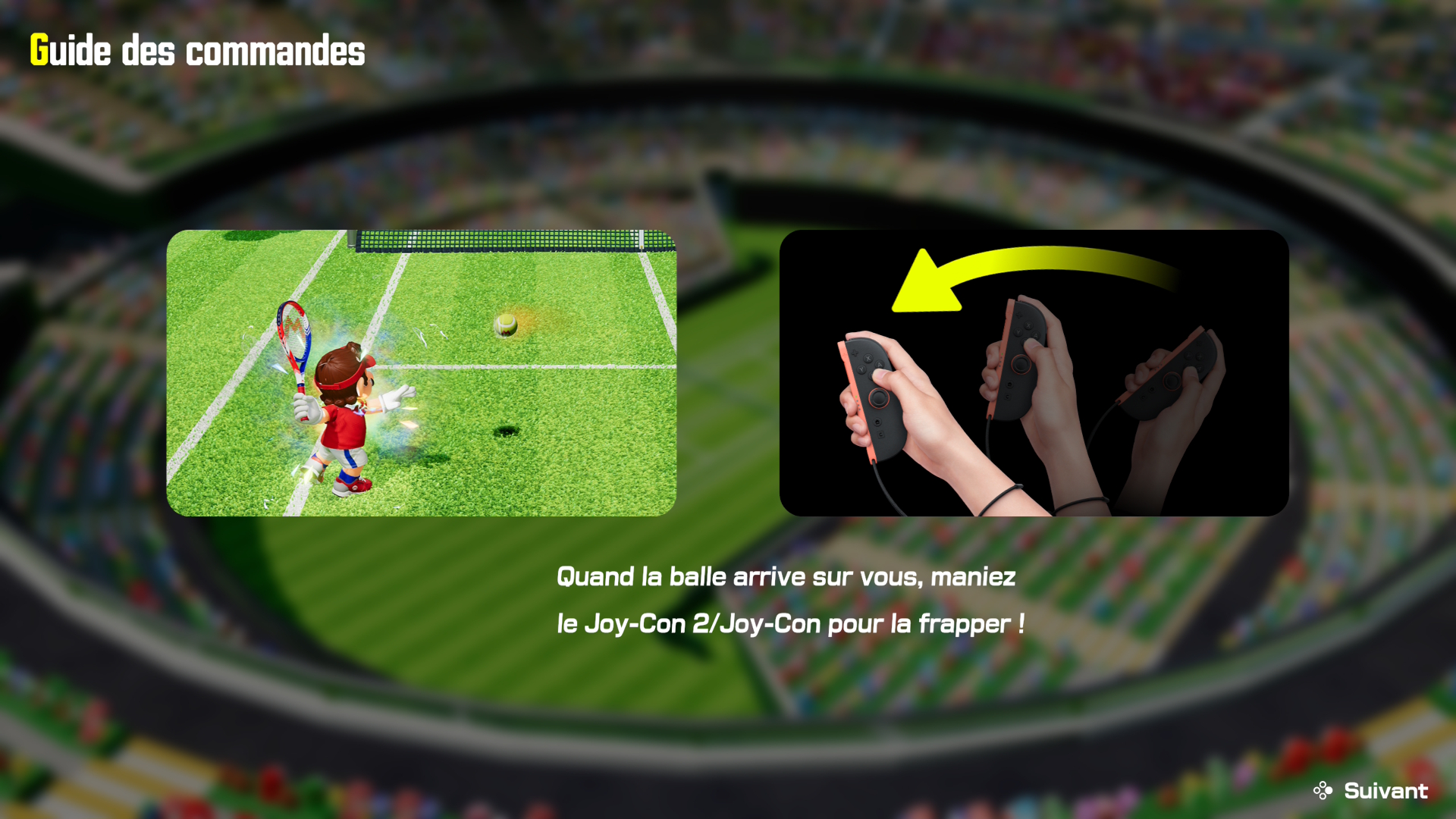 Est-ce que le passage à la Nintendo Switch 2 a permis à Mario Tennis Fever de se faire une petite beauté ? Tout à fait. Le jeu est fluide, les personnages affichent des détails de textures que l’on ne voyait pas sur les opus précédents, et certains terrains ont gagné en finesse côté habillage. Maintenant, lorsque vous êtes dans une partie effrénée en deux contre deux et que les effets fusent de partout, ne nous mentons pas : vous n’aurez pas l’œil sur les écailles de Bowser ou sur le maillage du maillot de Mario. Je note tout de même quelques petites bizarreries d’affichage, notamment avec le Stade Dur, dont les détails sont très sommaires en jeu mais beaucoup plus détaillés lors du revisionnage de l’action précédente. En revanche, point particulièrement énervant : pourquoi nous imposer, avant chaque début de match, le guide des commandes ? Au bout d’une heure, les contrôles sont assimilés ; pourquoi ne pas avoir proposé une option pour désactiver ce guide ?