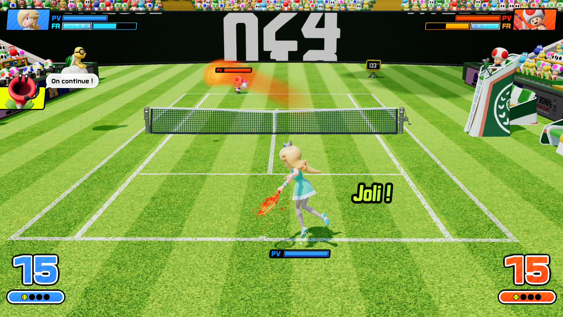 On finira très brièvement avec la partie sonore. Côté bande-son, on reste sur du grand classique de la licence Mario Tennis. Si elle ne restera pas dans vos OST à écouter en dehors du jeu, elle a le mérite d’habiller correctement nos matchs, sachant se montrer discrète lors des moments de tension, comme les balles de jeu. Comme indiqué plus tôt, la Fleur Cancan fait également ses débuts comme commentatrice en VF. C’est d’ailleurs le seul personnage à bénéficier d’un doublage dans le jeu. S’il est possible de désactiver les commentaires pour les matchs classiques via les options, il ne sera en revanche pas possible de la rendre muette pour les modes Tournoi et Aventure.