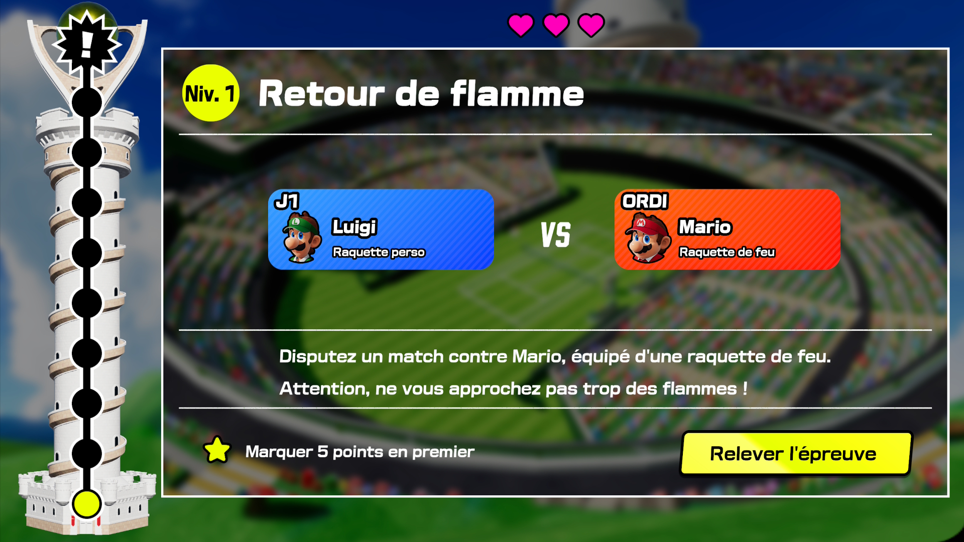 La Tour des épreuves, de son côté, vous propose d’enchaîner 10 missions avec des conditions spécifiques : affronter un adversaire qui a une raquette précise, renvoyer les balles de l’adversaire, ou encore faire des retours sans que ce dernier ne puisse toucher la balle. Certaines épreuves se permettent quelques fantaisies en utilisant des terrains spéciaux ou encore en mettant en place des matchs à deux, voire trois contre un. Il y a trois tours à débloquer, ce qui se fait relativement rapidement, et une fois ces derniers terminés, vous aurez accès aux épreuves à la carte. Un total de 100 épreuves à réaliser dans l’ordre de votre choix, avec trois objectifs à remplir pour chacune (ce qui vous occupera un bon moment si vous comptez obtenir les cinq médailles du jeu, visibles dans le menu principal).