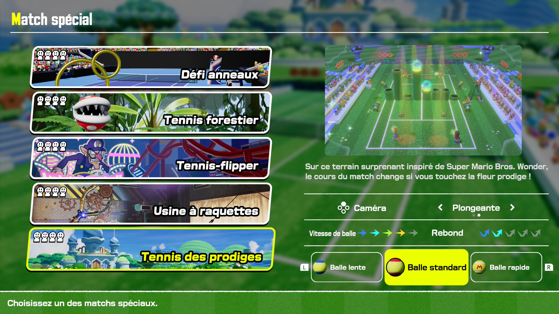 On arrive à la partie la plus « fun » avec le mode Jeux Spéciaux. Les matchs spéciaux vous permettront de participer à cinq activités spécifiques : le défi anneaux, où vous devrez envoyer la balle dans des anneaux pour marquer plus de points que votre adversaire ; le tennis forestier, où les plantes Piranha pourront gober vos balles ; le tennis-flipper, où vous devrez tenter de rentrer la balle dans des trous pour déclencher un jackpot, tout en faisant attention aux bumpers ; l’usine à raquettes, qui vous donnera accès en plein match à différentes raquettes à récupérer sur le terrain ; et le tennis des prodiges, qui vous demandera de ramasser sept graines prodiges pour gagner, mais où toucher la fleur prodige pourra déclencher des événements étonnants…