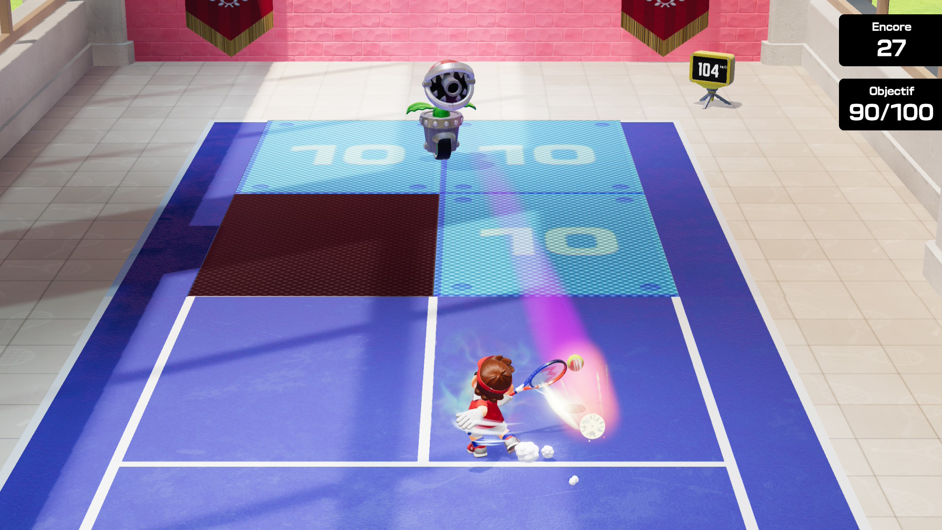 Vous trouverez également le Défi Score, toujours dans les Jeux Spéciaux. Vous pourrez participer au défi anneaux à deux ou quatre joueurs pour engranger un maximum de points. Le défi Plantes Piranha vous demandera de renvoyer des balles sans que l’adversaire ne les intercepte. Et le défi auto-tennis vous demandera de viser des zones précises du terrain pour obtenir des points et atteindre l’objectif demandé. Réussir ces différents jeux vous permettra de débloquer de nouveaux personnages, mais aussi de nouveaux terrains. Si je devais faire une petite remarque négative, il est dommage que les mini-jeux de l’académie de tennis ne soient pas proposés en accès libre dans le mode Jeux Spéciaux.