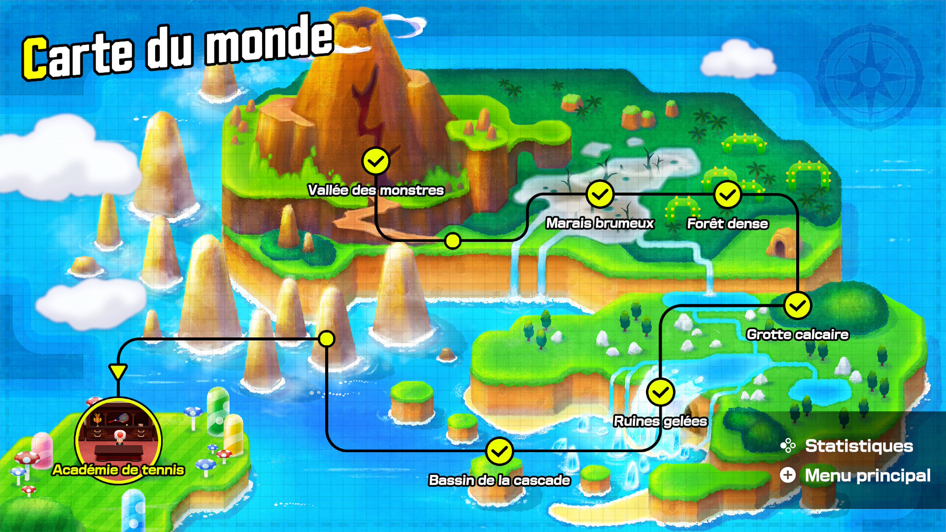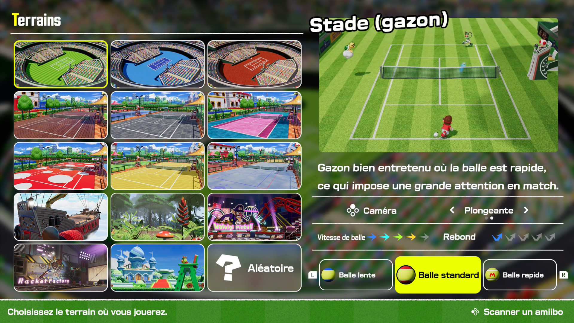 Je ne l’avais pas abordé plus tôt, mais si l’on omet le mode histoire et les terrains spécifiques au mode Jeux Spéciaux, les joueurs pourront s’affronter sur 14 terrains différents, chacun possédant ses propres caractéristiques influant sur la vitesse de balle et le niveau de rebond. À voir si Nintendo et Camelot proposeront des terrains additionnels (et des personnages ?) ultérieurement, mais en l’état, on reste sur un nombre de terrains très correct.