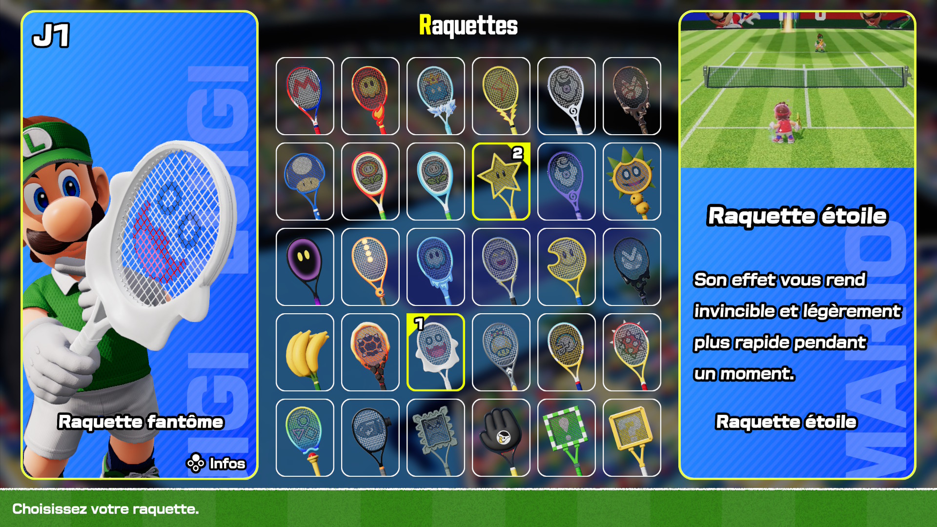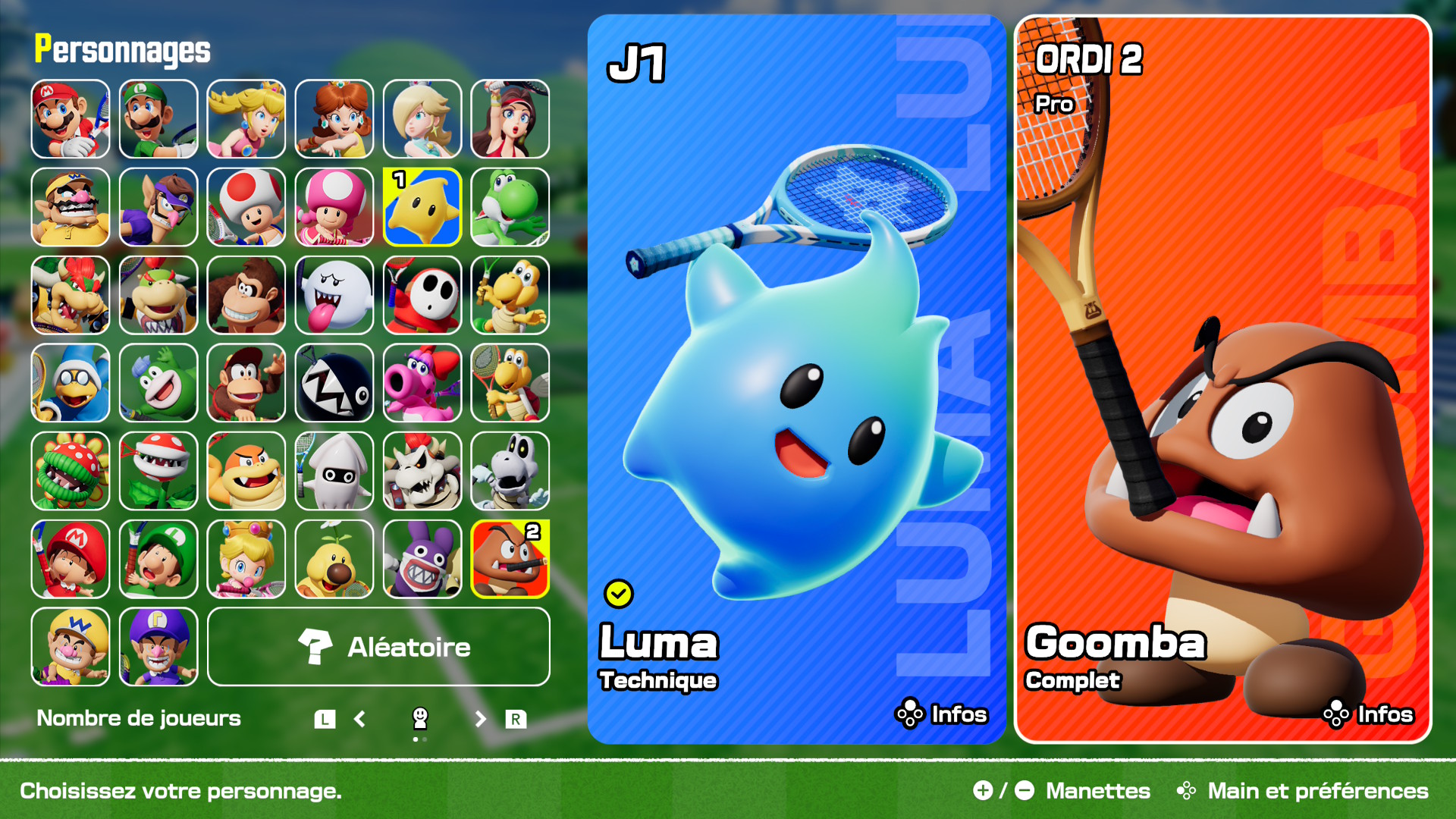 En finissant le mode aventure, vous remarquerez que vous n’avez débloqué que quelques raquettes et personnages. Le plus gros reste à débloquer en jouant seul ou entre amis au reste du jeu (un très bon point en comparaison de Mario Tennis Aces, qui ne proposait pas de contenu en plus de celui du mode histoire). Côté casting, Mario Tennis Fever compte pas moins de 38 personnages différents, répartis en différents profils de joueurs (complet, technique, ruse, vitesse, puissance, défense). Pour rappel, l’opus précédent proposait 16 personnages au lancement et 14 qui se débloquaient gratuitement chaque mois en participant aux tournois en ligne. On retrouve ainsi tout le casting de l’opus précédent, mais aussi quelques nouvelles têtes : Goomba, Carottin, Wiggler, Bébé Peach, Bébé Wario et le tout nouveau Bébé Waluigi. Avoir tout le contenu proposé de base, et à débloquer, reste très agréable et motive à continuer le jeu après l’aventure, notamment pour les joueurs solo. À noter qu’il y a aussi un grand nombre de variations chromatiques de personnages à débloquer (comme les Yoshi et les Maskass).