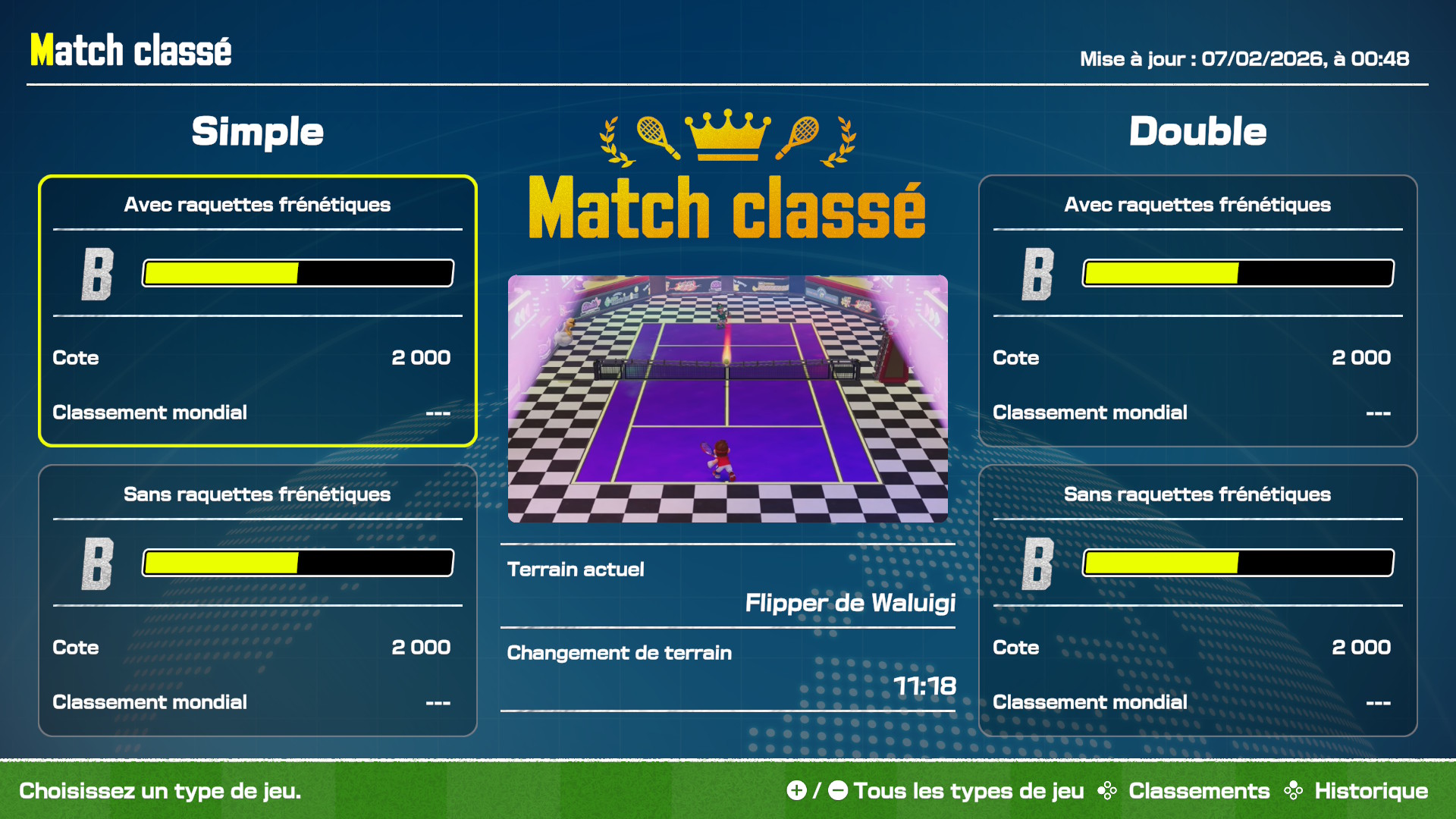 Pour les amoureux de la compétition, le mode Match Classé fait bien sûr son grand retour. Vous commencerez automatiquement au rang B. Vous aurez quatre classements distincts (simple, double, avec ou sans raquette frénétique) et votre objectif sera de vous hisser au sommet des classements. Le terrain de compétition sera affiché à l’écran et changera à intervalles réguliers.