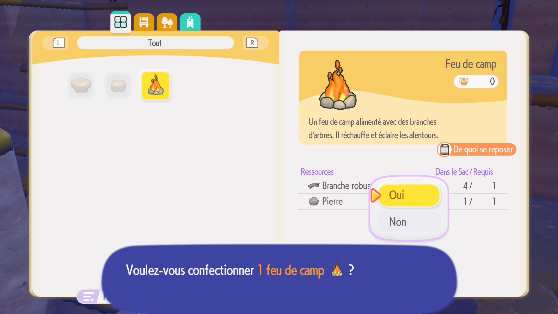Très vite dans le jeu, vous trouverez votre premier établi. Cet outil vous permettra de construire de nouveaux objets en utilisant les ressources trouvées dans la nature. Avec 3 rondins, vous construirez une table. Avec 2 feuilles, vous pourrez fabriquer un lit en paille, etc. Ce sont des dizaines, voire des centaines d’objets qui devront être fabriqués pour pouvoir progresser dans l’histoire et aménager les différentes zones. Ces derniers sont répartis dans différentes catégories : ameublement, objets divers, extérieur, objets utiles, etc. Certains habitats nécessiteront des objets particuliers qui ne peuvent être construits que via l’atelier. Par la suite, vous apprendrez également à utiliser d’autres éléments : l’électricité, la cuisine, une bétonnière… de nouvelles façons d’appréhender le jeu et de vous faire revenir sur vos pas pour améliorer votre lieu de vie.