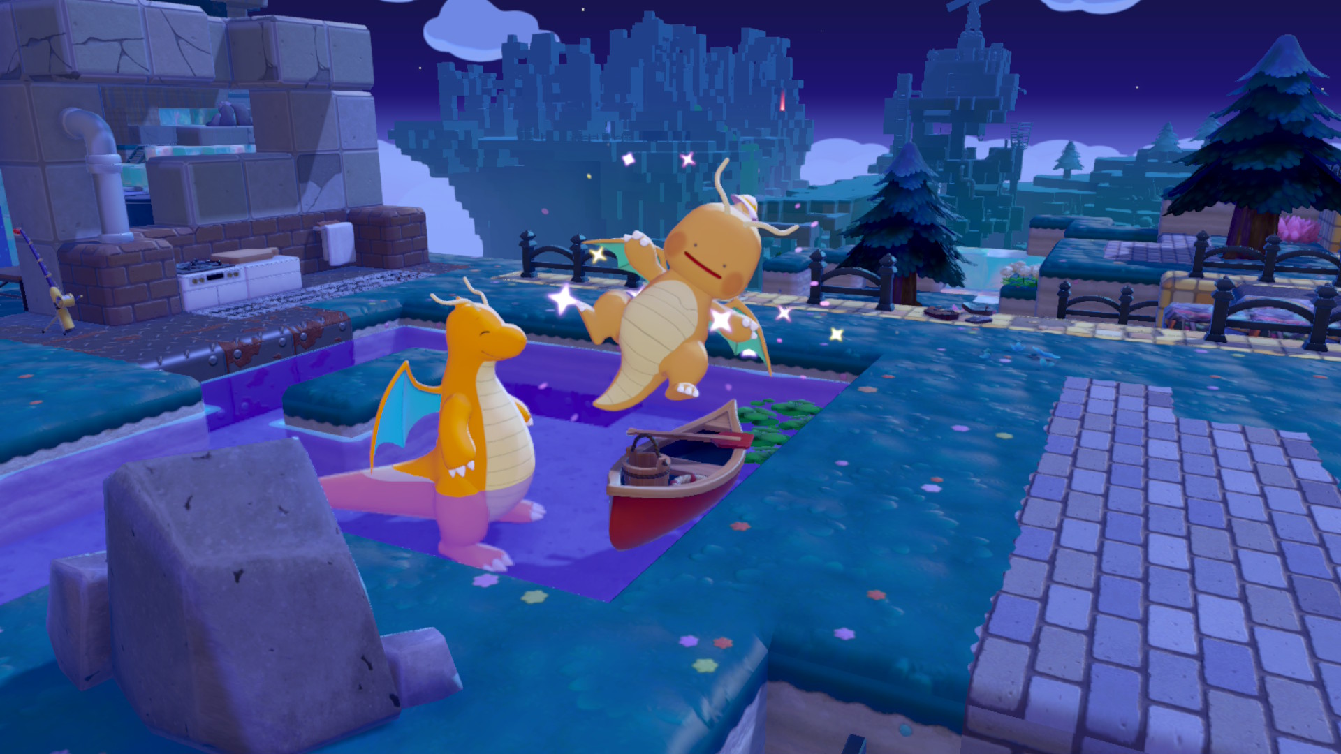 En plus des habitats naturels, vous pourrez aussi construire des maisons, soit en créant des espaces avec 4 murs et une porte, soit en utilisant des kits de construction. La règle pour qu’une maison soit habitable est d’y avoir au moins trois meubles. Point important également : vous pouvez voyager librement entre les zones, à condition de placer un drapeau Métamorphe dans celle vers laquelle vous souhaitez vous rendre. Point négatif concernant les constructions fermées que vous confectionnez manuellement : la caméra peut se montrer assez pénible dans les zones exiguës. Vers la fin du jeu, vous ferez également très souvent la chasse aux matériaux pour progresser. Il sera ainsi important d’apprendre à optimiser votre temps de jeu, faire les demandes d’objets aux Pokémon, etc. Heureusement, pour la collecte de matériaux, vous pourrez aussi compter sur Baudrive, qui vous permettra d’explorer des îles riches en ressources. La seule condition pour les débloquer, à raison d’une visite par jour, est de trouver et d’interagir avec des Poképoupées.