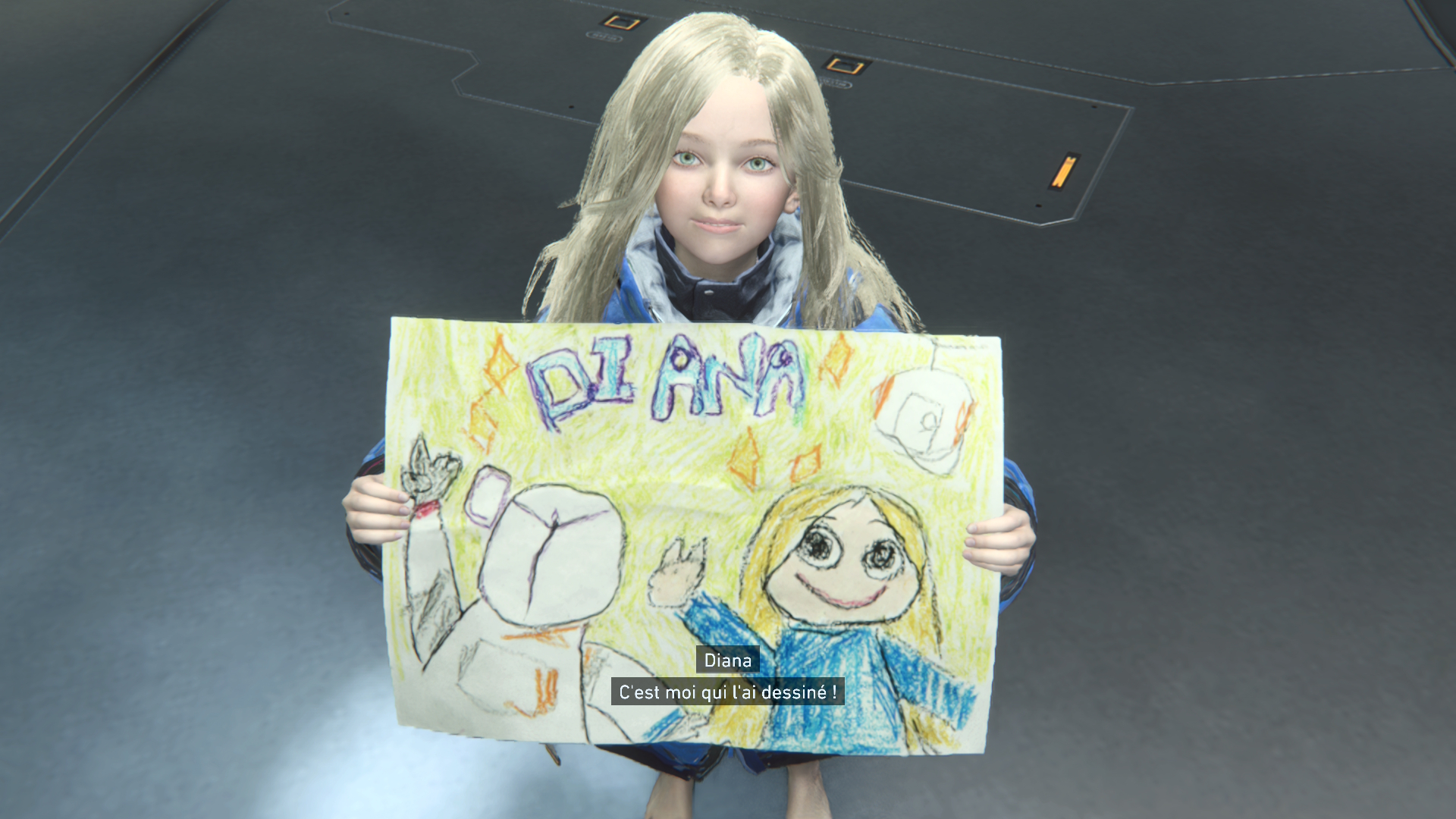 Vos explorations de la station seront l’occasion de découvrir de nombreux documents qui vous permettront d’en apprendre davantage sur les travaux en cours au Berceau, mais vous pourrez aussi mettre la main sur des Mémoires vectorielles, qui vous permettront, une fois au Refuge, de reproduire des éléments de la Terre pour le plus grand bonheur de Diana. Les trouver est purement facultatif, mais voir Diana s’émerveiller devant une balançoire ou des crayons de couleur vient contrebalancer le ton grave de la situation avec l’innocence d’une jeune enfant. On la verra d’ailleurs offrir à plusieurs reprises des dessins à Hugh au fur et à mesure que leur relation grandit.