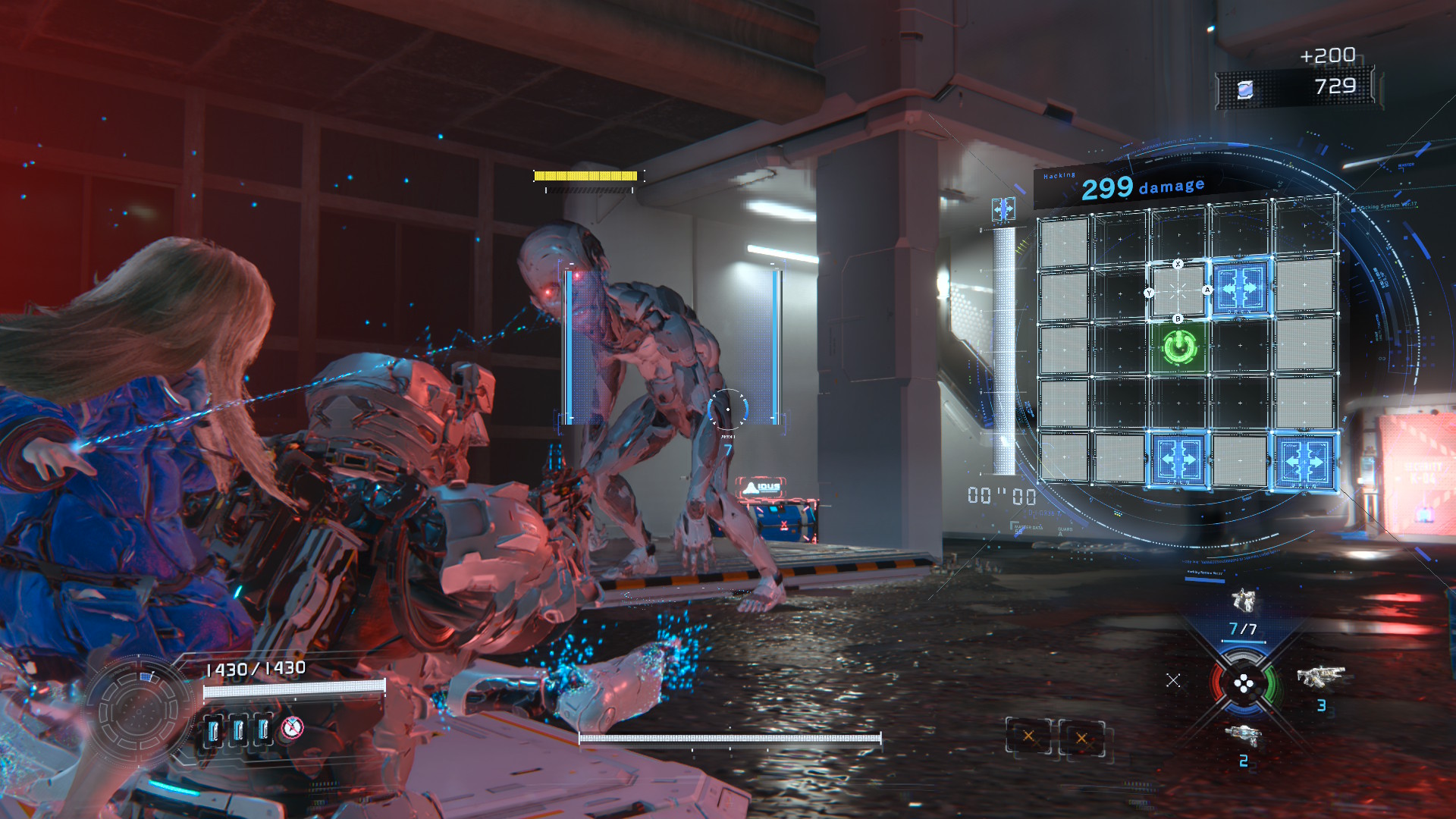 À peine déclarés comme hostiles par IDUS, des robots sont envoyés contre Hugh. Équipé d’un simple pistolet cinétique, ce dernier est malheureusement inefficace contre les robots ennemis qui sont protégés par un blindage renforcé. C’est là que Diana entre en scène. Grâce à ses capacités, elle est capable d’afficher une matrice de hacking en ciblant un ennemi. Se déclenche alors un mini-jeu de puzzle qui vous demandera de déplacer le curseur jusqu’au nœud d’objectif vert. En l’atteignant, vous infligerez des dégâts de hacking et vous exposerez les points faibles de l’ennemi, qui, une fois visés par Hugh, feront nettement plus de dégâts. Le travail d’équipe sera donc indispensable pour pouvoir progresser dans la station.
