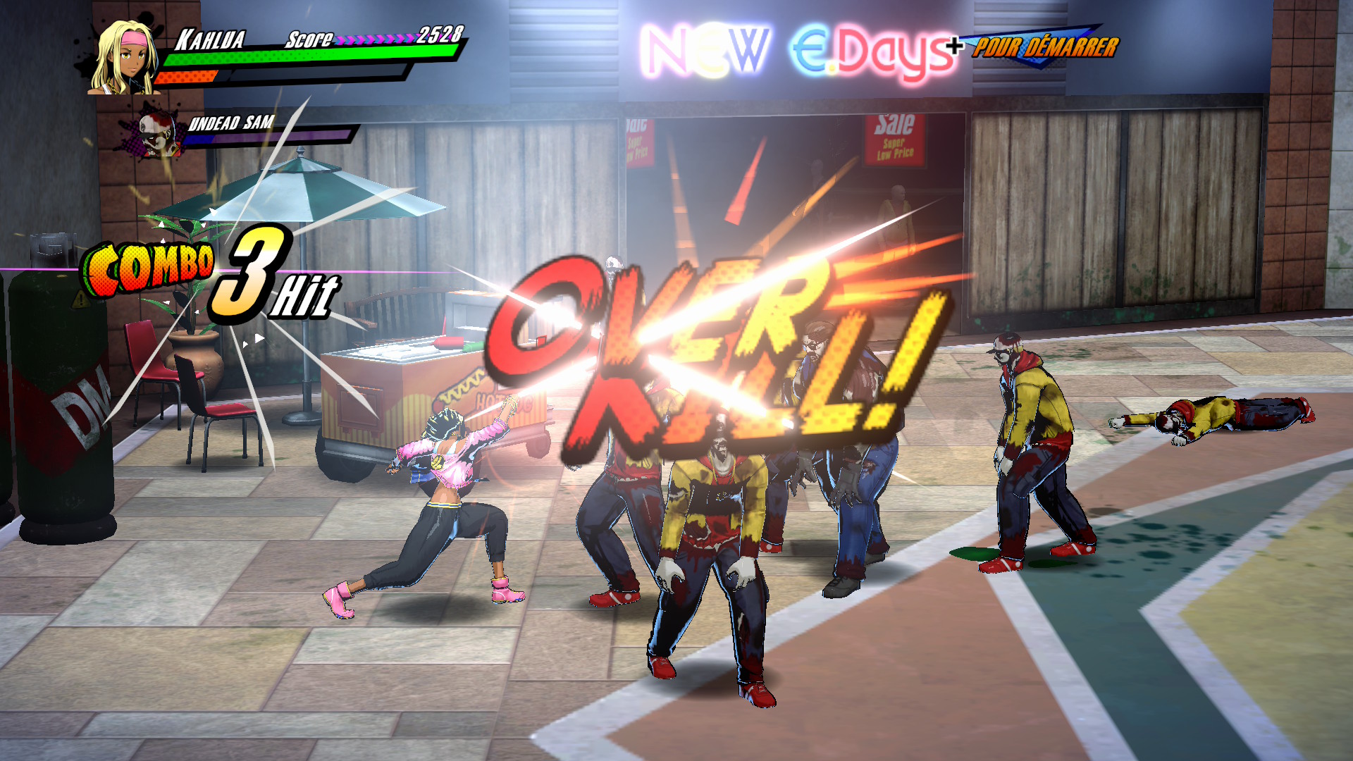 Côté Gameplay en revanche, le titre offre une expérience très complète et vraiment très plaisante. Il est aisé de faire des combos en martelant le bouton d’attaque mais il est possible de réaliser des variantes en appuyant sur des touches de directions (uppercut, coups arrière…). Le titre inclut aussi un système de garde parfaite afin de contrer les attaques puissantes mais aussi une jauge de rage qui permet, une fois remplie de porter des coups plus puissants mais surtout un Beat Rush, une sorte de coup ultime dévastateur. Et toute une panoplie d’armes à ramasser vous attend (certaines se stockent dans notre inventaire). Enfin, vous pouvez aussi ramasser de la nourriture, la stocker et pourquoi pas la convertir en menu si vous avez les bons “plats” lors des passages dans votre van.