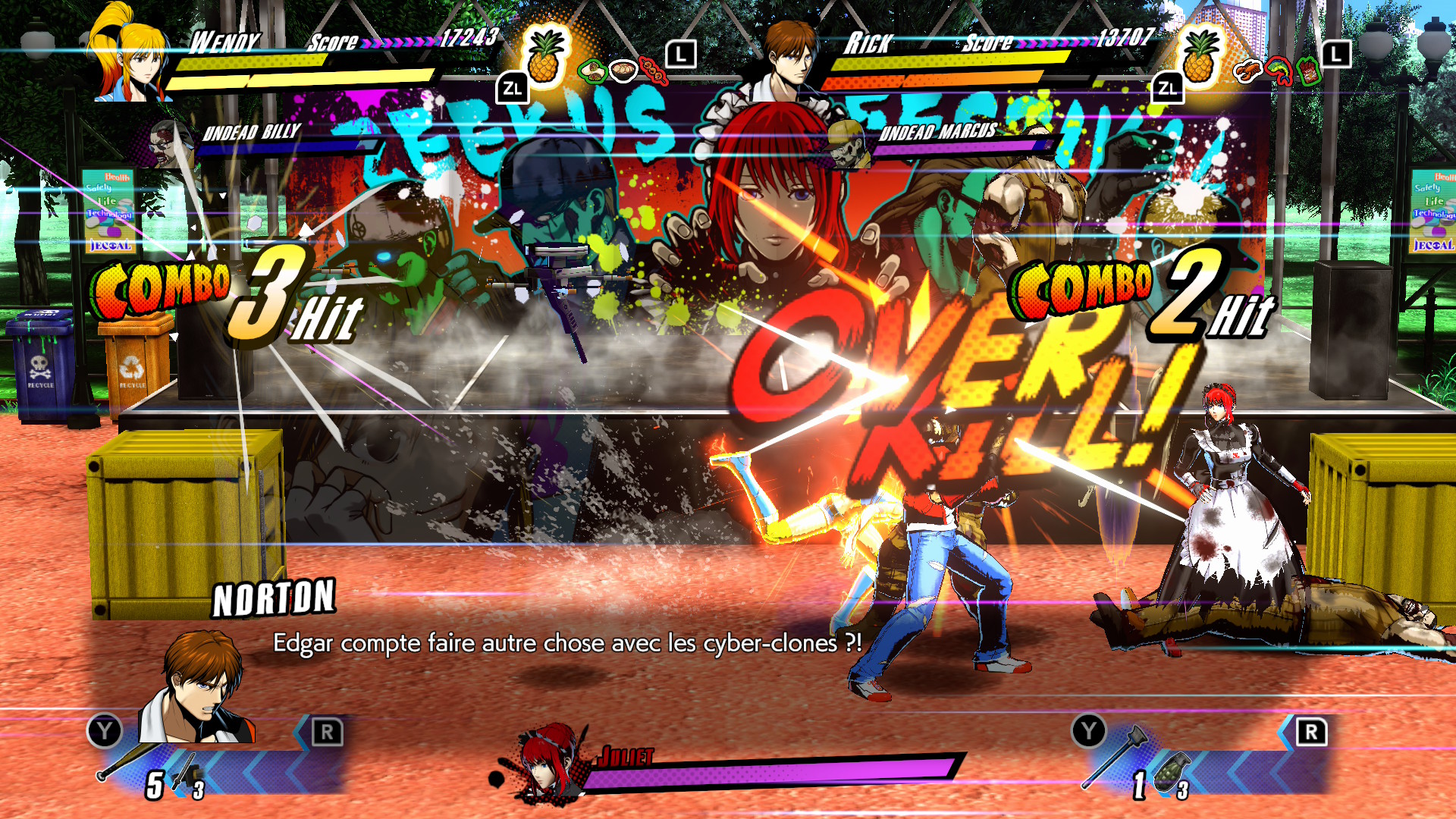 L’histoire se déroule entre le 2e et le 3e épisode de la série originale. On retrouve Rick Norton et Douglas Bild (les deux flics/héros de la police de Neo-Sisco) qui doivent affronter le retour du virus Zeekus (qui booste les capacités physiques) et des clones cybernétiques qui transforment les citoyens en zombies combattants. C’est complètement déjanté, humoristique et auto-dérisoire : cut-scenes à gogo, dialogues absurdes, références aux anciens jeux, un running gag avec deux méchants ridicules (Edgar et Scarlett), et même une scène de zombies qui dansent sur du Thriller de Michael Jackson. Le ton est très 80’s/90’s cartoon (et un poil nanardesque), avec beaucoup de clins d’œil.