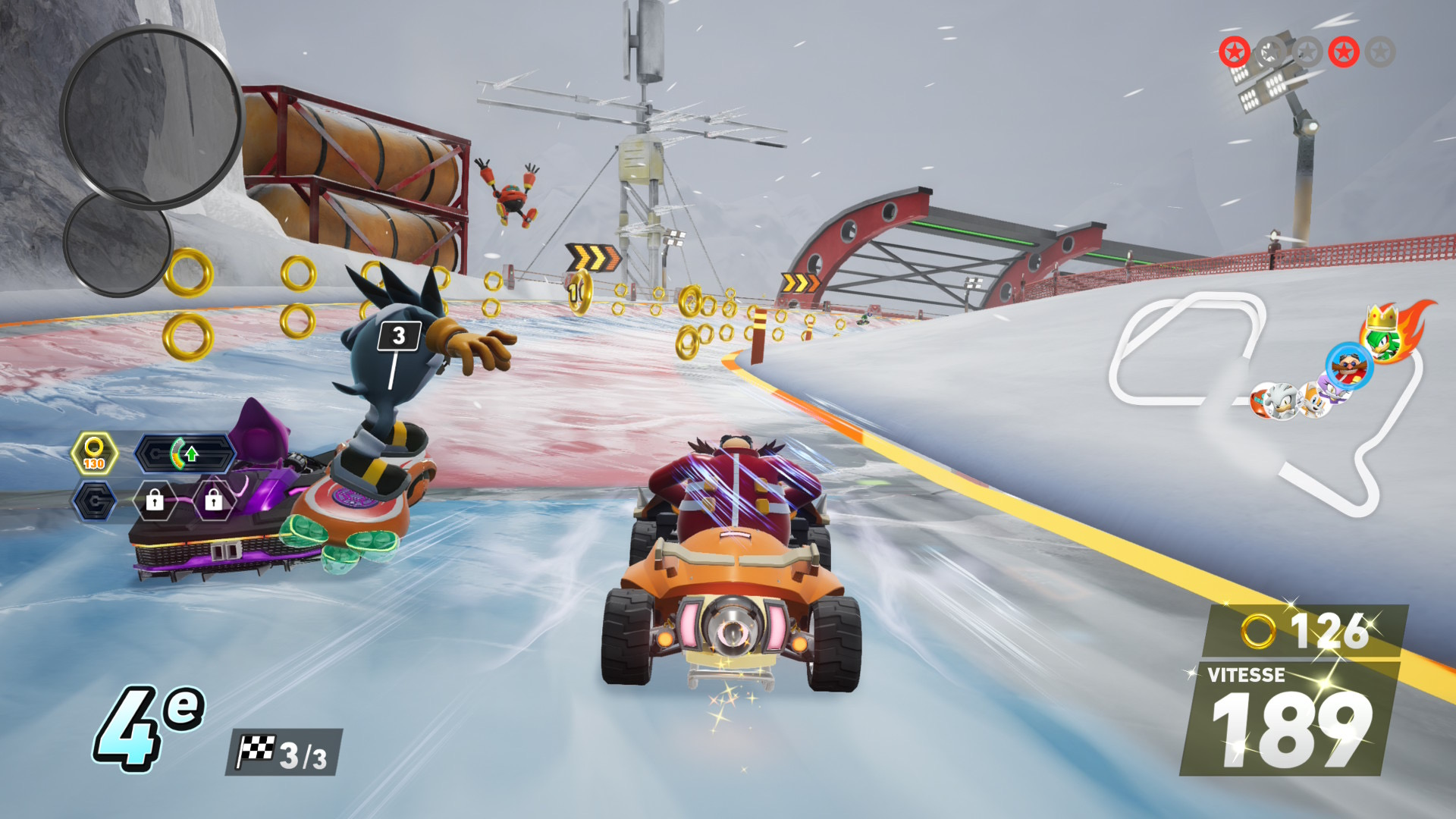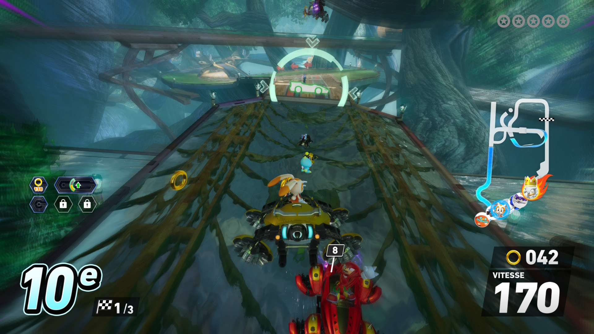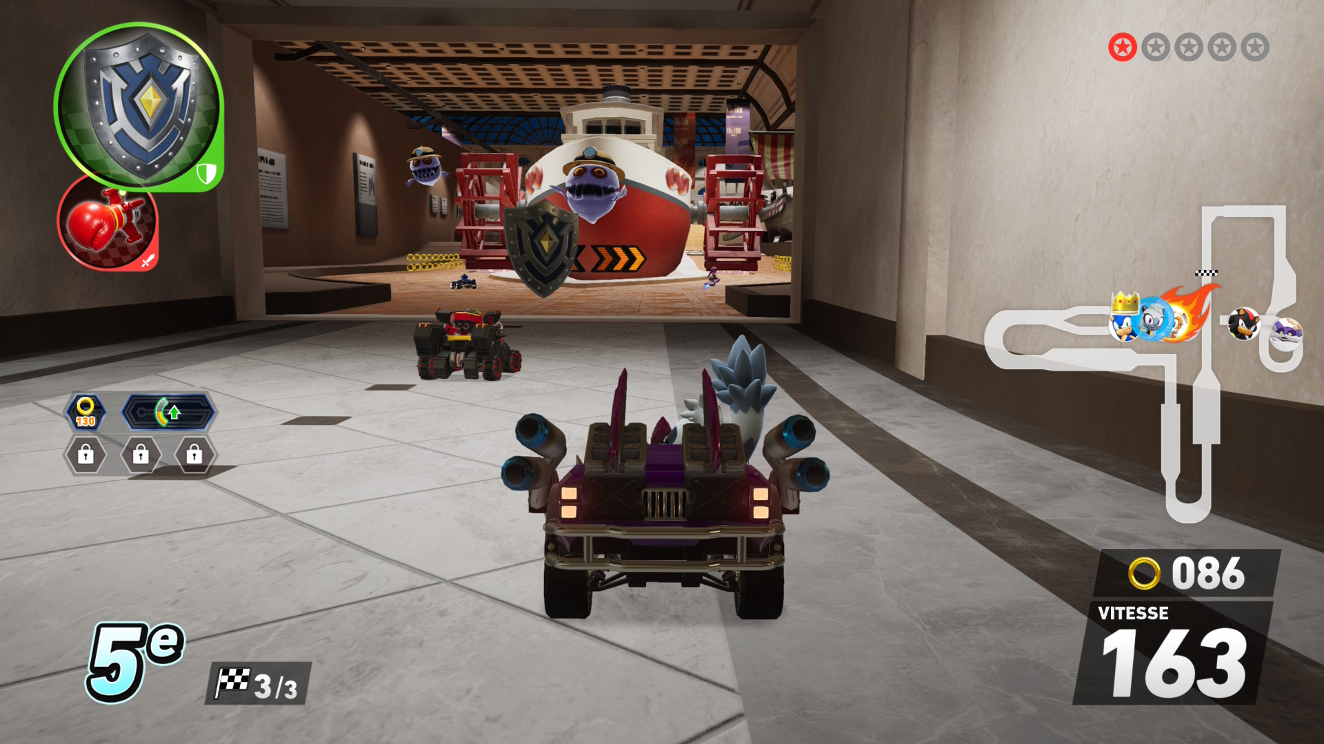 Côté contenu, Sonic Racing CrossWorlds propose une offre généreuse. Le mode solo comprend les différents grand prix, le contre-la-montre ou encore le jeu en ligne. On retrouve également l'Aire de compétition, qui apporte un vrai plus, avec des objectifs variés qui cassent la routine des courses classiques. Six types de courses différentes par équipe vous sont proposées, avec des objectifs comme la collecte d'anneaux, le fait de se foncer dedans pour gagner en vitesse, etc. Les joueurs peuvent également débloquer de nombreux personnages, véhicules et éléments de personnalisation. Avec 45 véhicules disponibles, il y aura de quoi faire, sachant qu'on peut en modifier la couleur ou faire figurer les autocollants de notre choix, que l'on peut acheter via la monnaie virtuelle du jeu. Monnaie que l'on acquiert en remportant des courses…