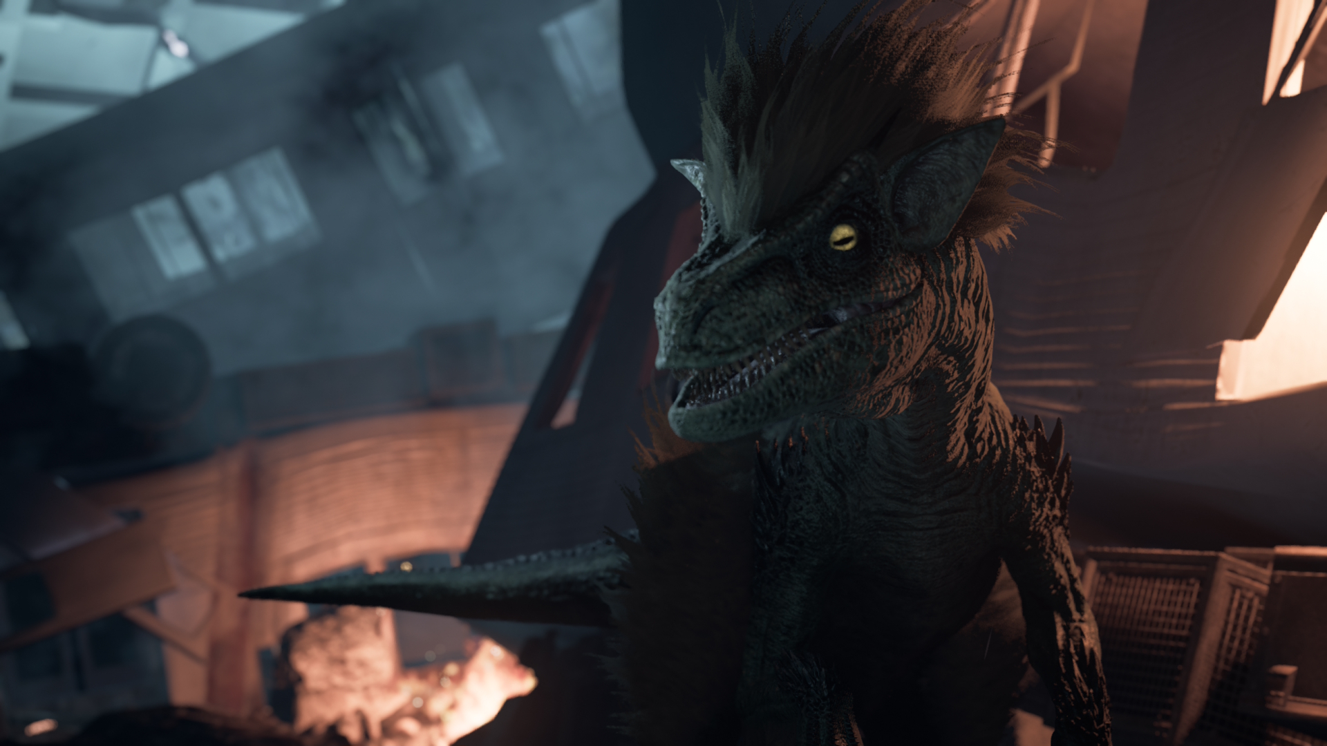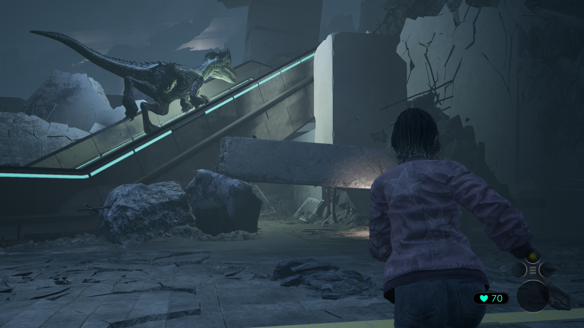 Les mécaniques de Tokyo Scrambre sont simples : vous planquer à l’abri des zinos, et profiter d’un moment d’inattention de leur part pour filer vers la zone suivante. Pour cela, vous passerez l’essentiel du temps à rester accroupie, le temps que les dinos détournent le regard. Des fois cela peut se faire de manière très fluide… et des fois, l’IA du jeu en décidera autrement et fera camper les monstres devant le seul chemin qu’il est possible d’emprunter vers la sortie. Pour réussir à sortir de certaines impasses, Anne pourra compter sur Diana, sa montre connectée qui lui permettra d’activer quelques infrastructures. Ouvrir un portique de sécurité, déclencher un éclairage ou une alarme, ou encore faire s’écraser des ascenseurs. Les actions apparaitront sur l’interface de jeu, et ce sera à vous de trouver comment utiliser la situation déclenchée à votre avantage.