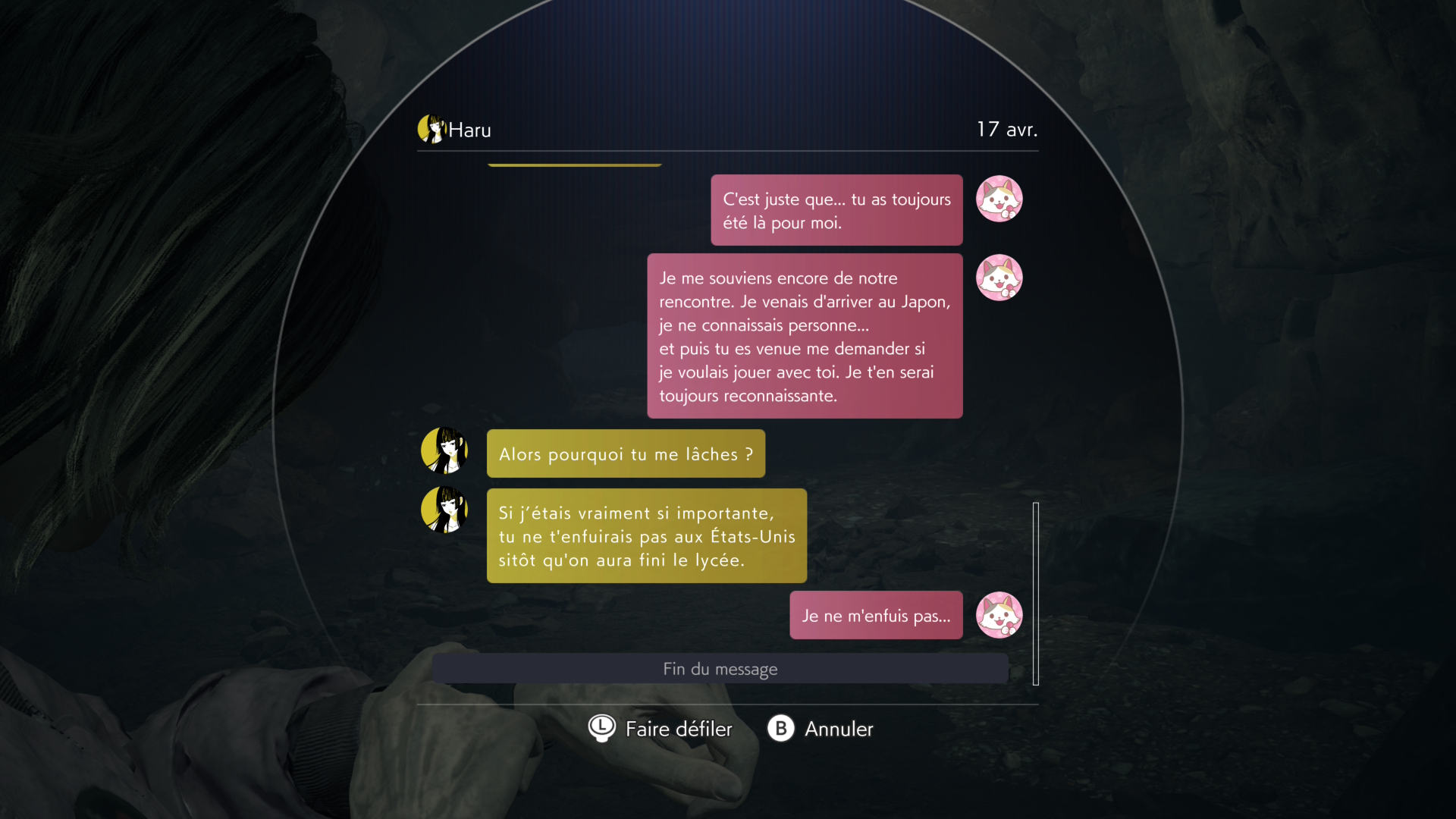 Ne se contentant pas uniquement de vous faire avancer dans les couloirs (même si ça aurait très bien pu fonctionner tel quel), votre exploration sera régulièrement entrecoupée d’échanges avec vos amis de la surface lorsque votre réseau vous le permettra. Devant une camarade prise aux piège dans les décombres, on notera surtout que les personnages ont un caractère relativement exécrable vis à vis de l’héroïne, parlant tantôt de leur problème de cœur (les éternels triangles amoureux), ou encore du fait que Anne s’apprête à bientôt repartir en Amérique. Le tout étant seulement narré sous la forme de textos à chaque début de chapitre rend l’empathie très difficile pour les amis de la surface.