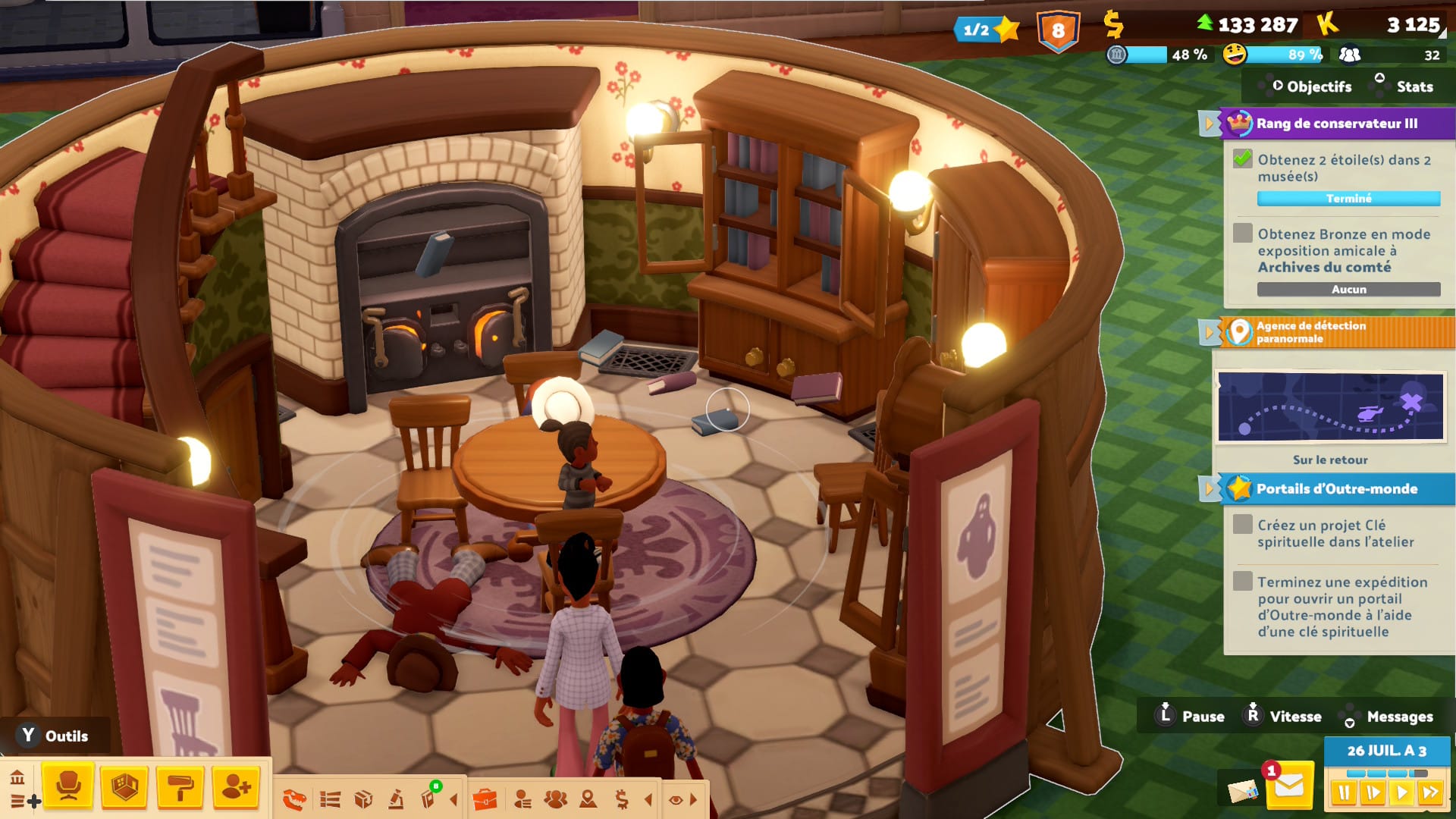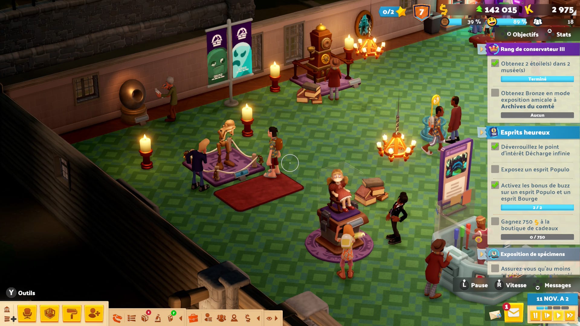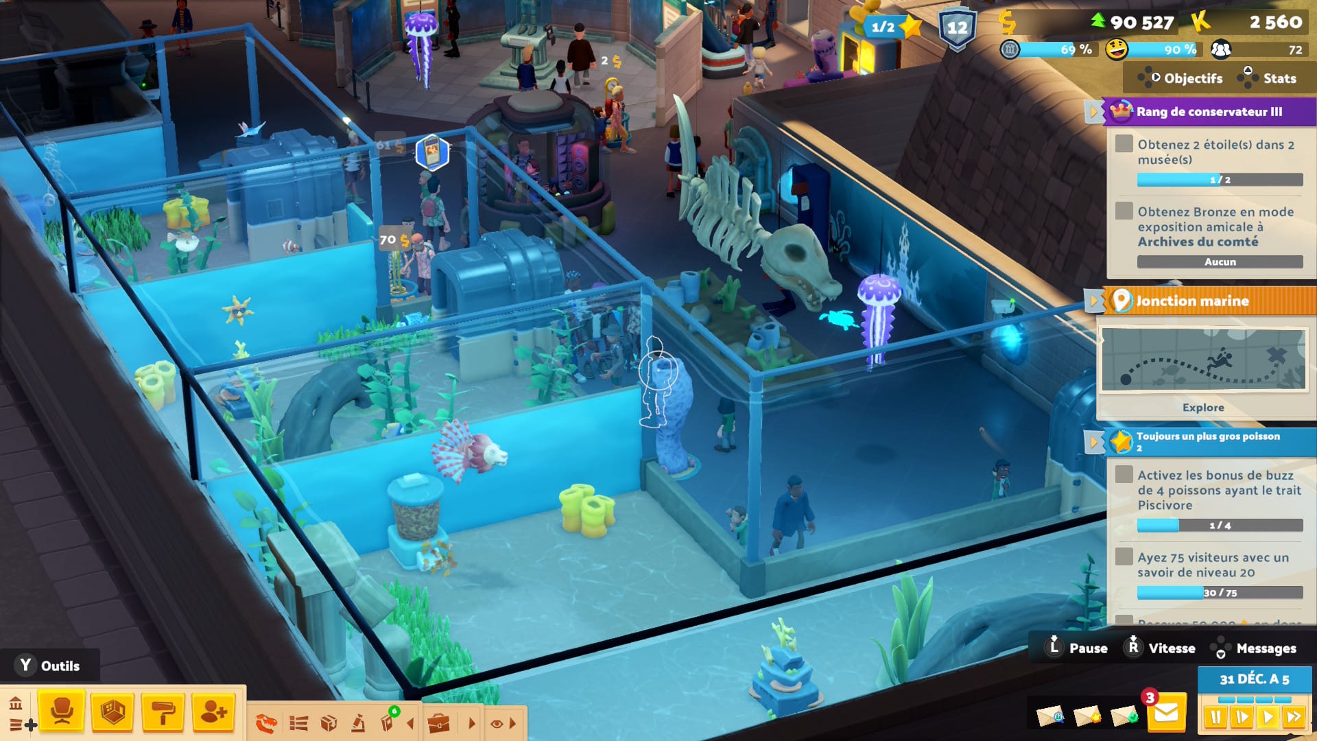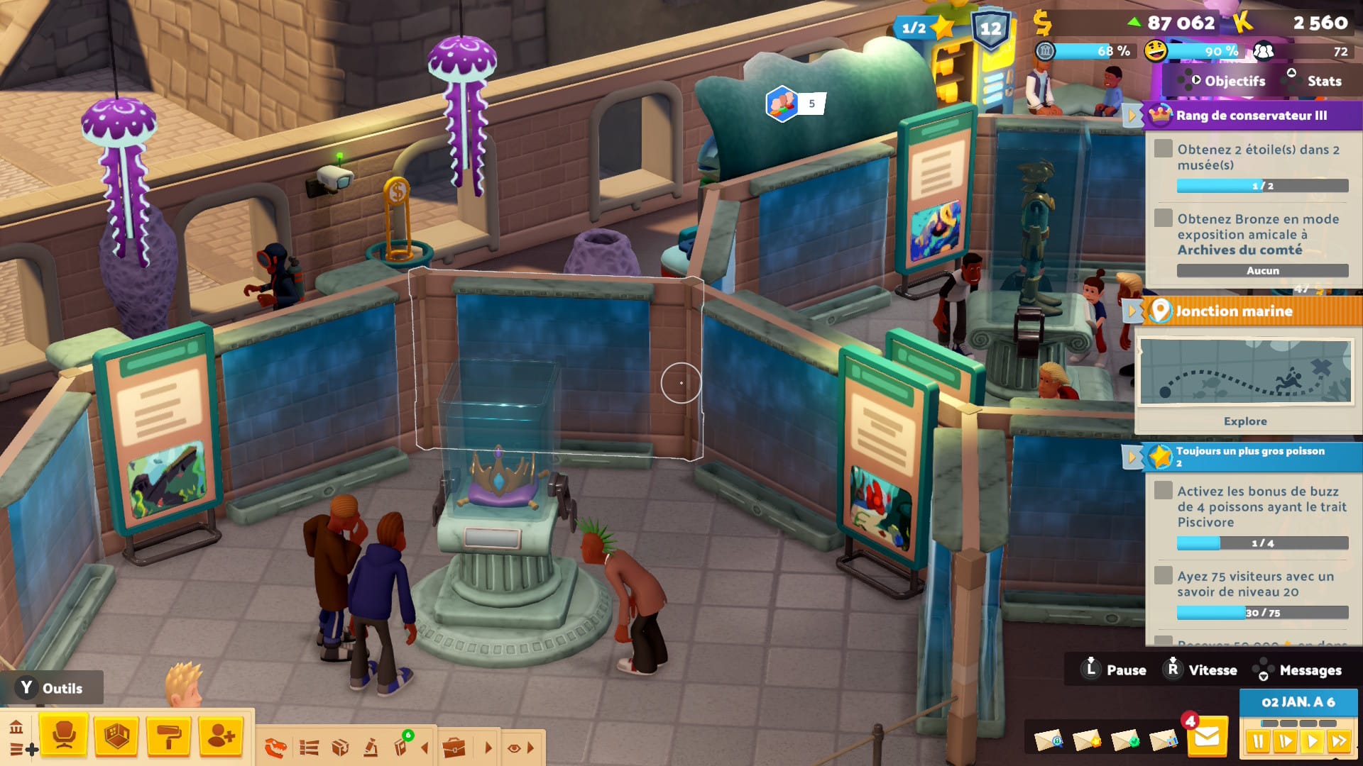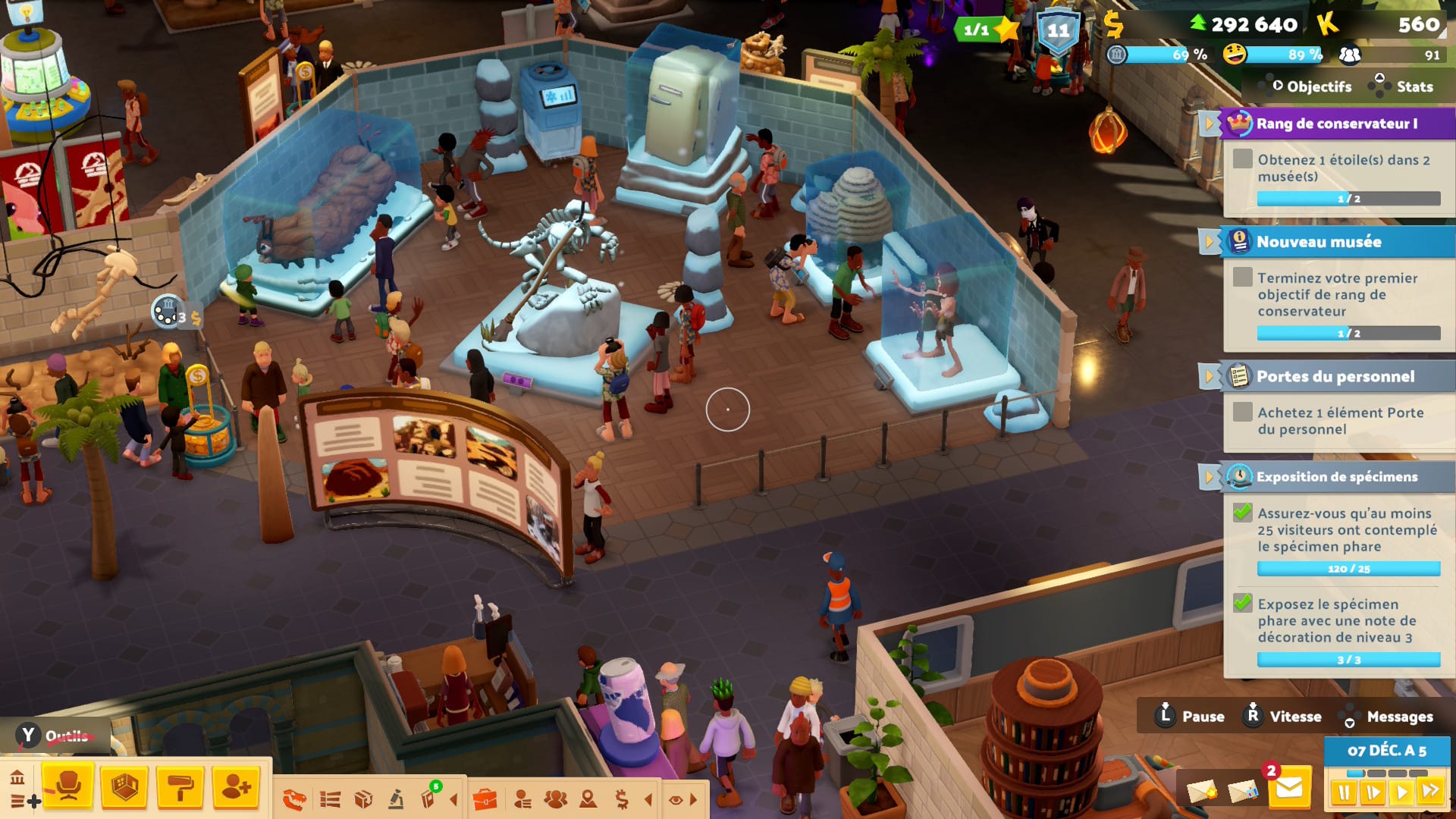 Vous débutez donc avec un musée qui a pour vocation d’exposer des vestiges préhistoriques. Vous allez donc apprendre les mécaniques de base et peu à peu comment optimiser votre musée afin de le rendre certes attirant mais aussi qualitatif. Une fois l’objectif principal atteint, vous n’aurez pas forcément à quitter votre musée définitivement. Cette fois, vous devrez par exemple basculer sur un autre musée dont le thème principal est le monde marin. Une fois un certain nombres d’objectif atteints, vous reviendrez alors au premier musée et ainsi de suite avec tous les musées que vous allez débloquer au fur et à mesure. Ainsi, le sentiment d’accomplissement n'en est que meilleur puisque vous reprenez votre travail là où il en était avant de réaliser de nouvelles tâches. Cela donne un résultat bien plus intéressant que la formule précédente et ses “niveaux”. Et chaque musée est très différent l’un de l’autre (préhistoire, océans, surnaturel, espace, etc.), vous incitant d’ailleurs à jouer relativement différemment puisque les attentes ne sont pas toujours les mêmes et tout particulièrement sur le thème du surnaturel.