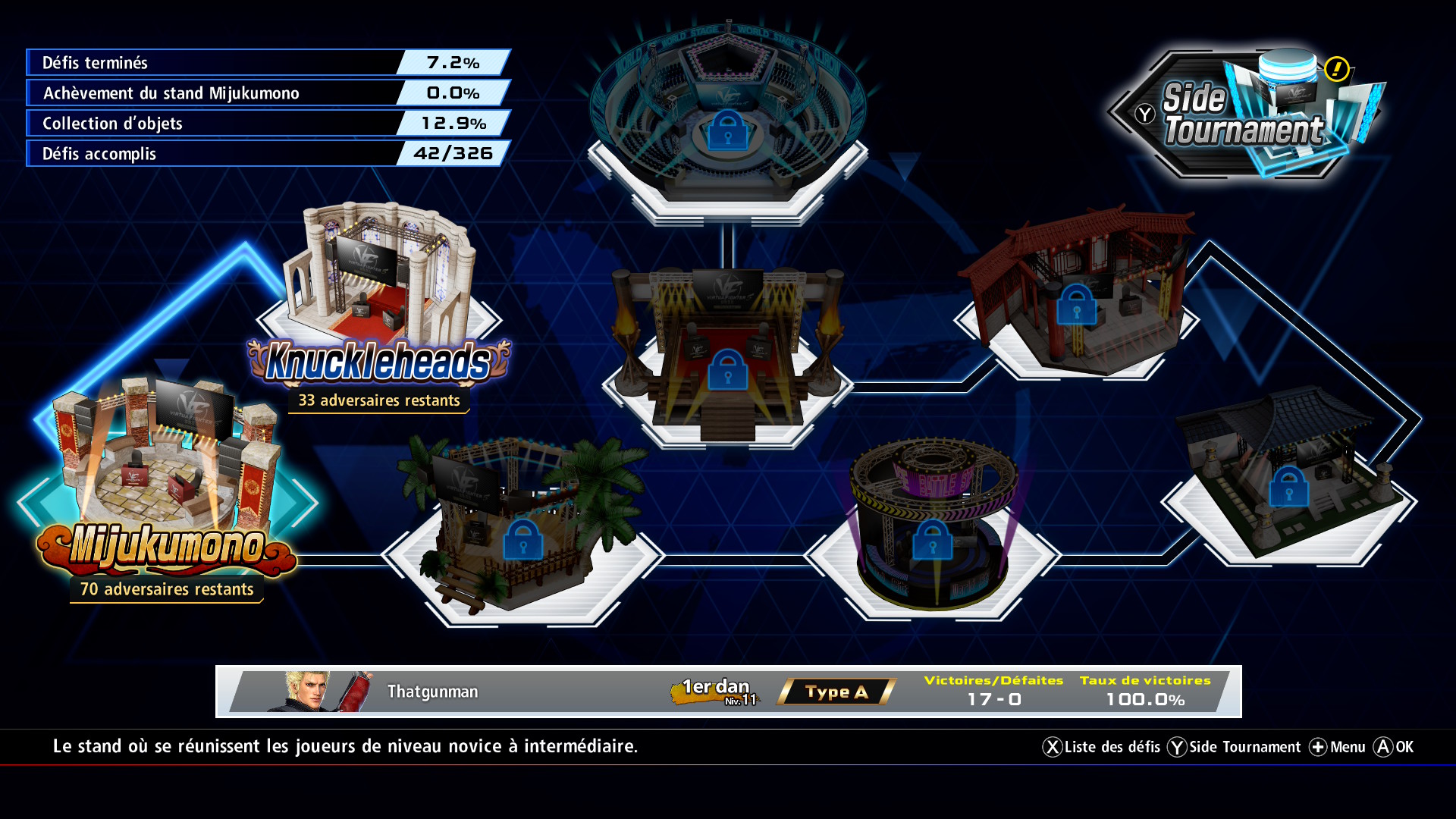 Côté contenu solo, difficile de s’enthousiasmer. Une fois encore, l’excellent Quest Mode de la première version console n’a toujours pas fait son retour, remplacé cette fois-ci par un World Stage nettement plus sommaire. Le principe est simple : on choisit une arène, puis on enchaîne les combats pour gravir les échelons. Pas de mise en scène particulière ni d’enrobage visuel, simplement une succession d’affrontements jusqu’à remplir une jauge permettant d’accéder au combat suivant, avec à la clé une montée en grade et, parfois, le déblocage de nouvelles arènes.