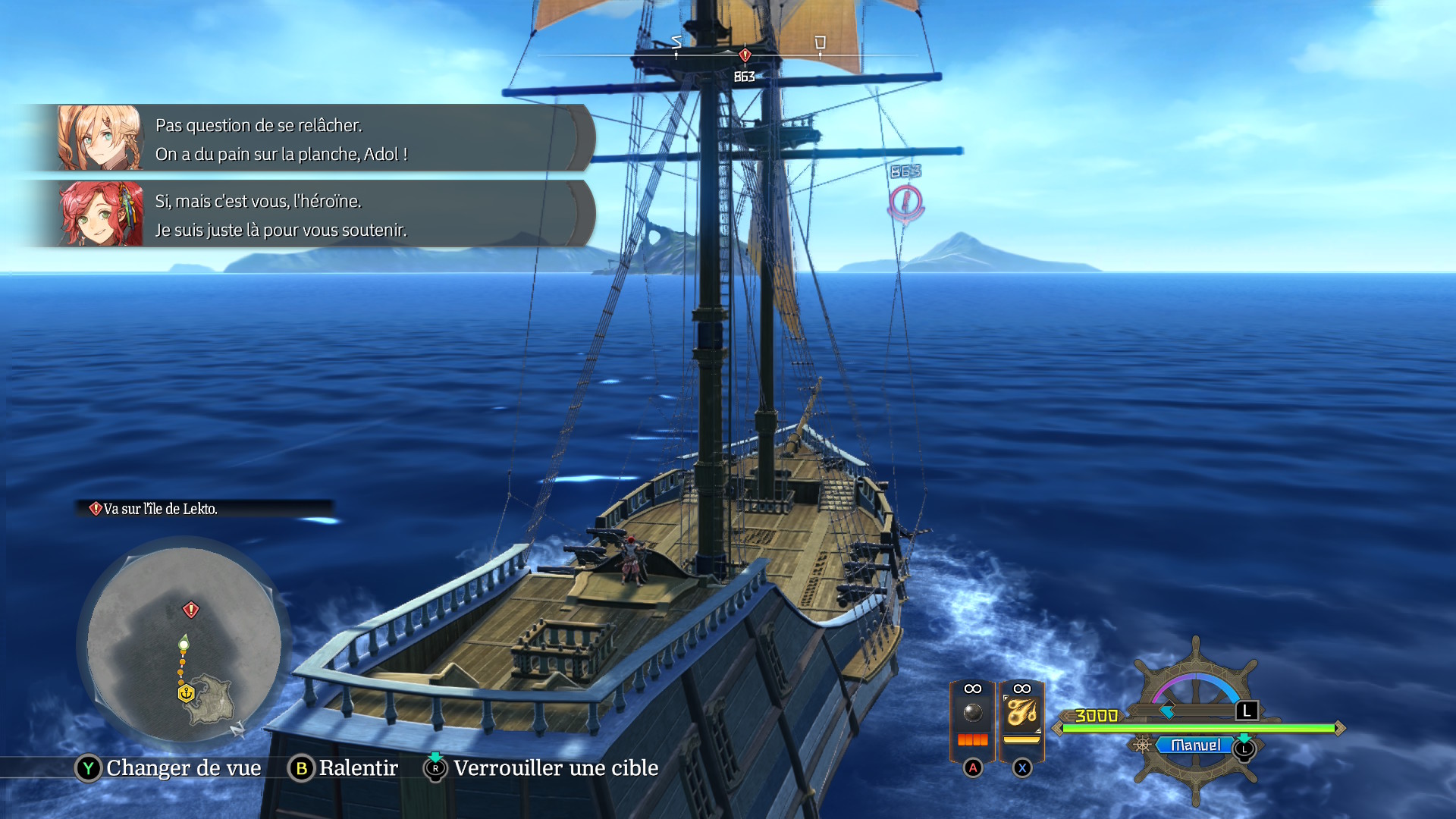 Le prétexte est tout trouvé pour explorer le golfe d’Obélia à bord d’un navire qui n’est plus de première jeunesse, et visiter les nombreuses îles qui jalonnent la mer. On se déplace donc dans un bateau qui, réalisme oblige, ne file pas comme une Formule 1 et doit composer avec le vent pour avancer efficacement. Au début, la lenteur peut frustrer tant elle tranche avec le reste du jeu. Mais elle s’inscrit dans une logique d’amélioration progressive du navire, indispensable aussi bien pour l’exploration que pour les combats navals, sur lesquels nous reviendrons.