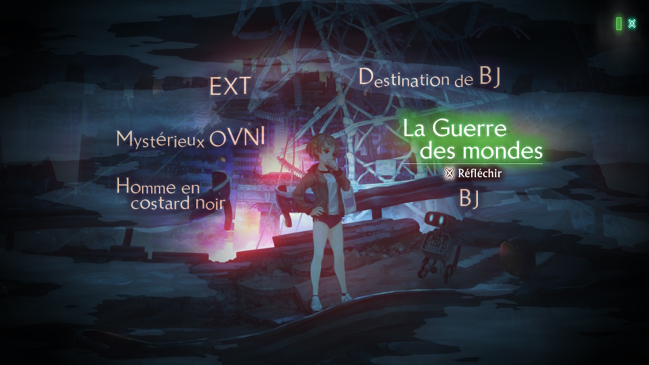 Les phases centrées sur l’histoire sont en fait une succession de tableaux en 2D où nous passons notre temps à discuter avec d’autres personnages, et à récupérer des indices dans l’environnement. En réalisant ces actions, le personnage que nous jouons débloquera des pensées. Il vous sera ainsi possible d’en apprendre davantage en faisant une réflexion personnelle, ou bien de partager vos pensées avec un personnage adjacent pour faire avancer l’histoire. Ces phases sont relativement calmes et dénotent complètement avec les combats.