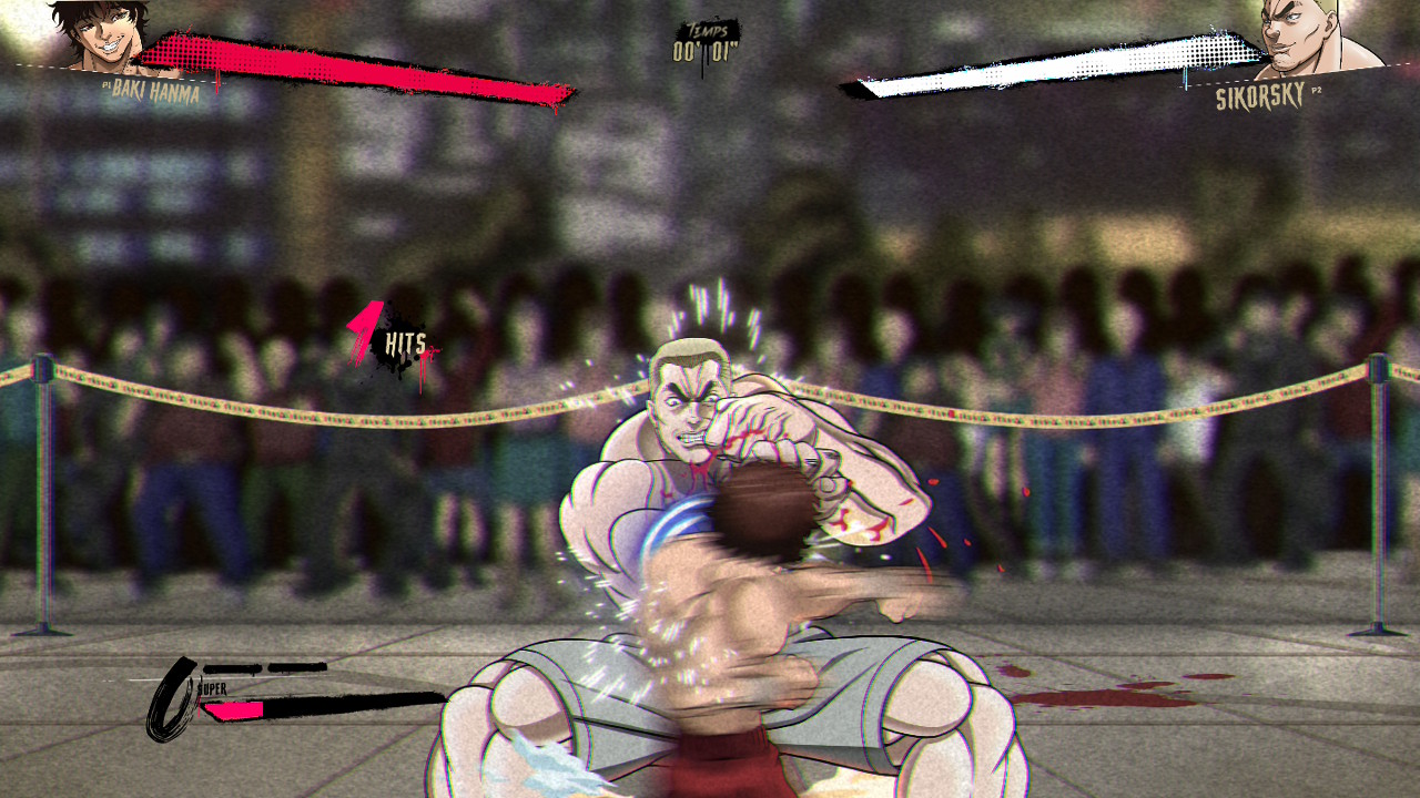 Les contrôles dans Baki Hanma: Blood Arena sont on ne peut plus simples. 4 touches pour toucher la tête ou le corps de l’adversaire, esquive gauche et droite en inclinant le stick dans lesdites directions, esquive en se baissant en inclinant le stick vers le bas, et enfin garde haute en inclinant le stick vers le haut. À cela s’ajoute la possibilité de faire des coups chargés en maintenant une des gâchettes L ou R. Et enfin, une fois la barre de spéciale chargée d’au moins une unité, vous pourrez déclencher un des coups spéciaux de Baki, infligeant des dégâts importants… à condition qu’ils touchent votre adversaire.