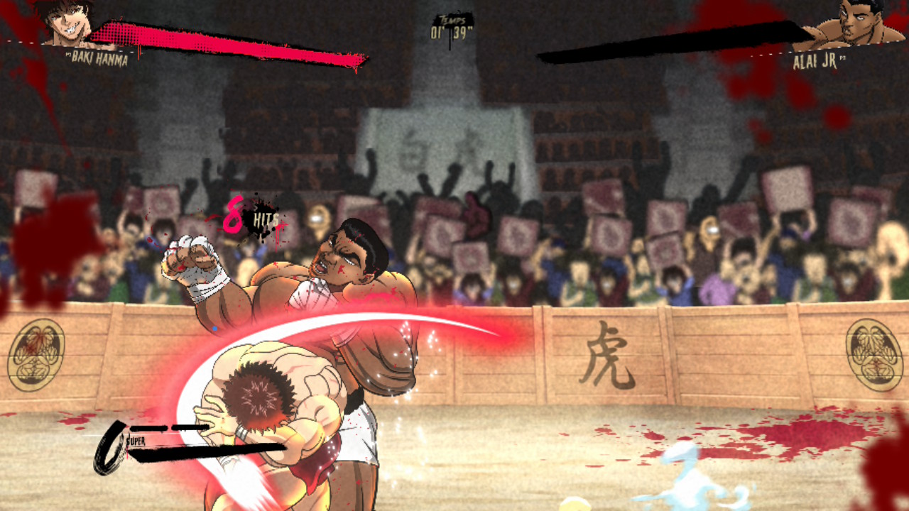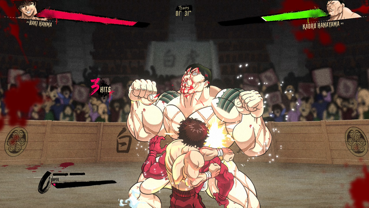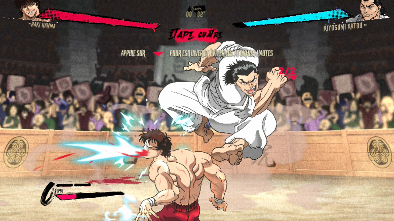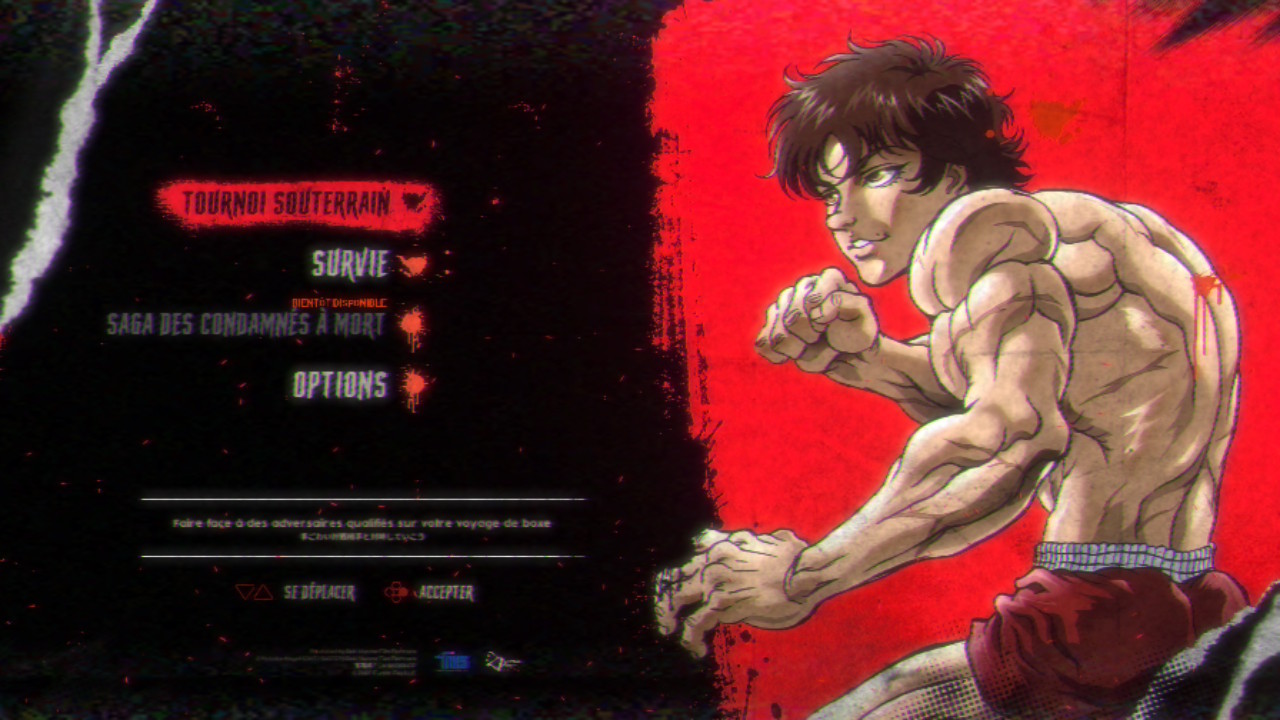 Côté habillage, si le titre reprend les modèles de l’animé, on reste tout de même sur une animation très sommaire se résumant à 2-3 sprites par attaques. Les douzes adversaires que nous affrontons durant l’histoire sont amenés de manière aléatoire chronologiquement parlant, faisant apparaître des adversaires que n’a pas réellement combattu Baki. Nous avons aussi des flashback qui apparaissent sans crier gare pour nous faire combattre certains ennemis cultes comme Biscuit Oliva. Côté bance-son, une nouvelle fois nous avons de la musique qui sera étouffée par les bruitages de coups. Un mode est également grisé dans le menu, sans que l’on sache si il sera débloqué prochainement, ou proposé en DLC.