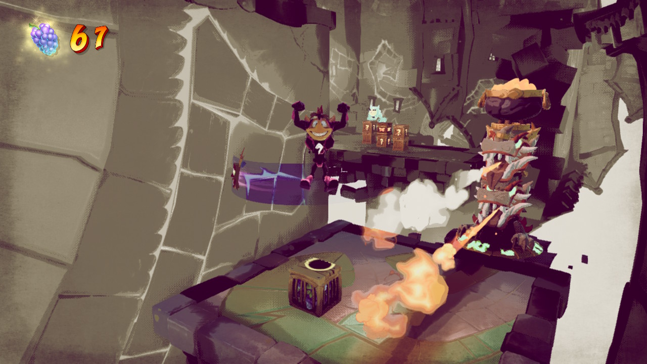 Ce qui fait tout autant plaisir, c’est de découvrir les nouveautés imaginées par Toys for Bob qui sont introduites progressivement. Outre les lianes et les masques déjà présentés, on découvre les caisses lance-flamme qu’il vaut mieux casser lorsqu’elles sont éteintes, on peut courir sur certains murs pour franchir des ravins et on doit ramasser des cassettes qui ouvrent des niveaux bonus à la difficulté extrême puisqu’ils consistent à détruire toute une série de caisses au-dessus du vide.