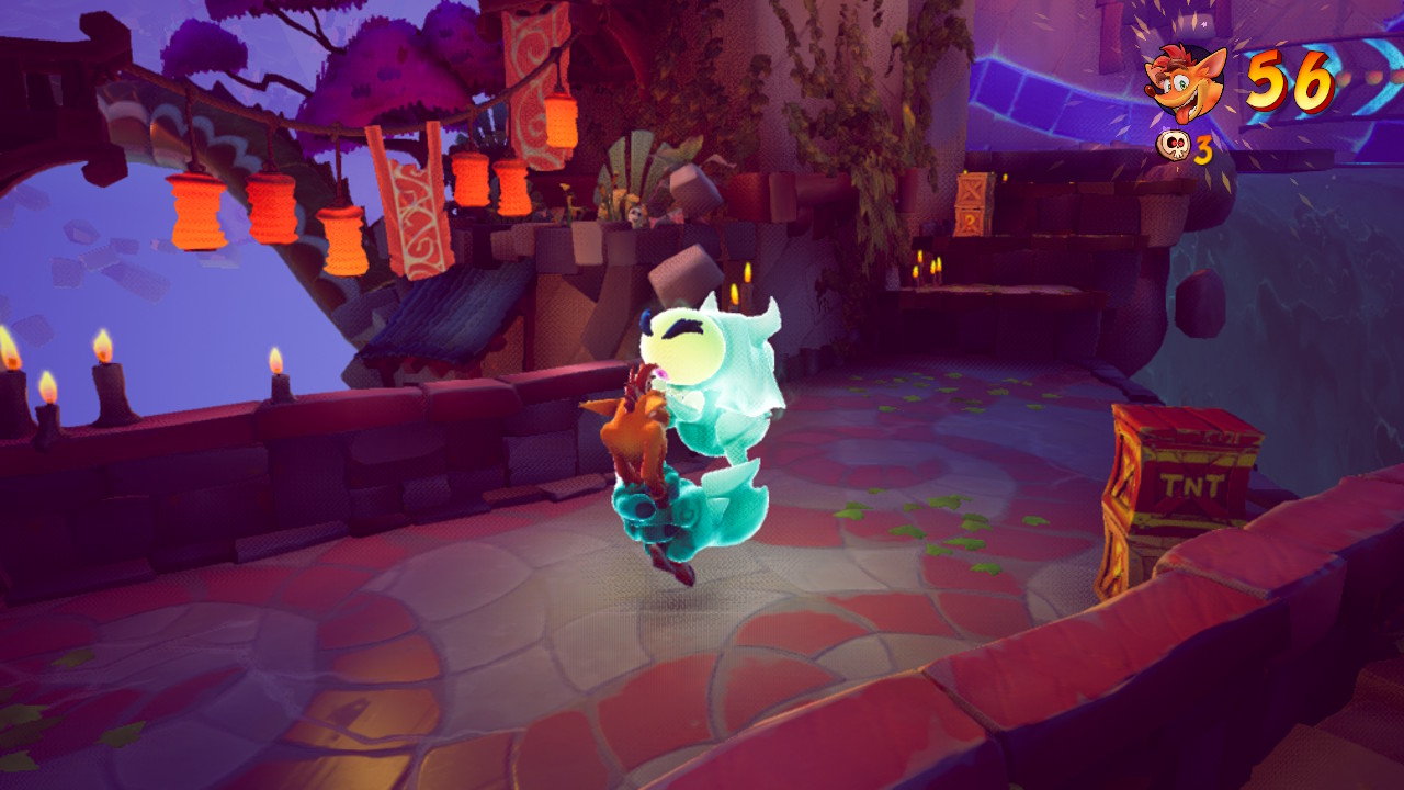 Ce qui fait également très plaisir, c’est que la difficulté et le challenge sont bel et bien au rendez-vous. Passé le premier monde qui est là pour nous habituer aux commandes, le principe de Die and Retry typique de la trilogie Crash Bandicoot est bien présent, les plateformes mobiles par exemple ne s’arrêtent que 1 seconde pour nous laisser embarquer et sont en mouvement le reste du temps. Malgré nos nombreuses morts, on prend son pied à avancer dans les niveaux, à relever les défis posés par le game-design et à explorer les moindres recoins. Les morts sont fréquentes mais rarement punitives grâce aux nombreux check-point et l’humour omniprésent, on n’hésite donc pas à explorer les moindres recoins et à prendre des risques pour détruire toutes les caisses et découvrir des zones secrètes. Certes, il y a désormais un cercle qui indique notre position au sol lorsqu’on saute mais en vérité, il ne change pas grand-chose et nous aide au contraire à mieux calculer nos sauts.