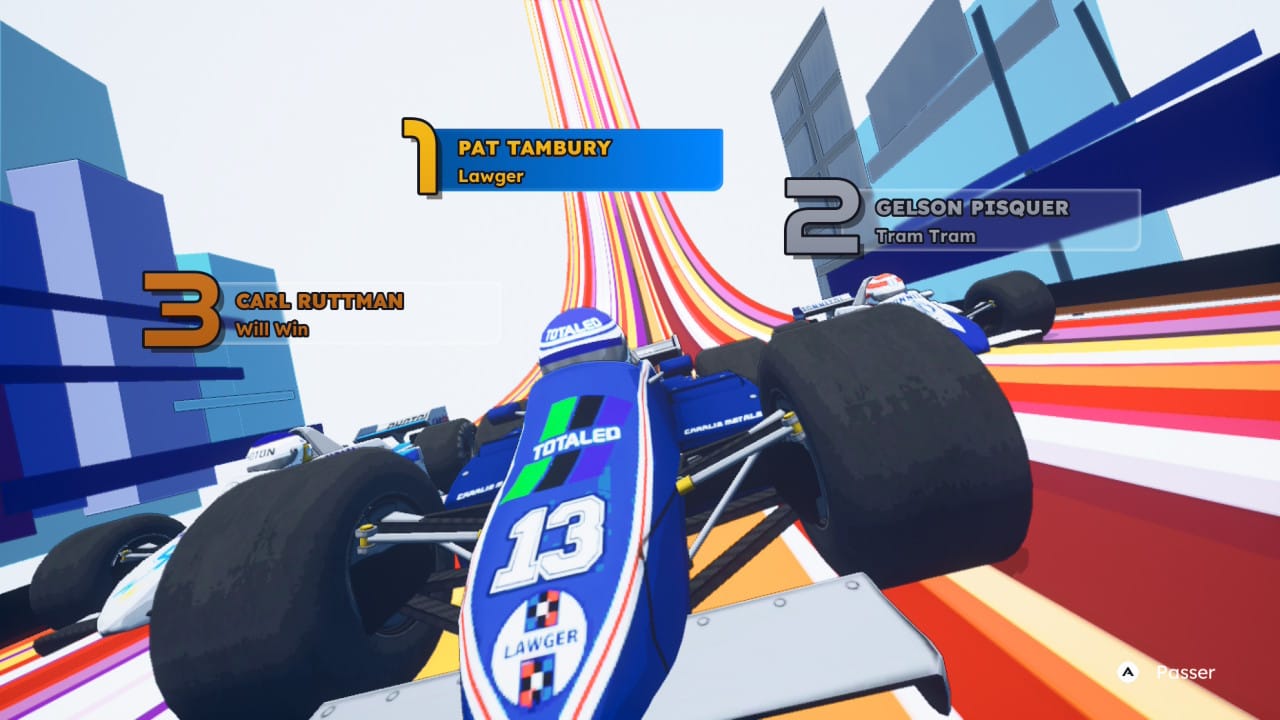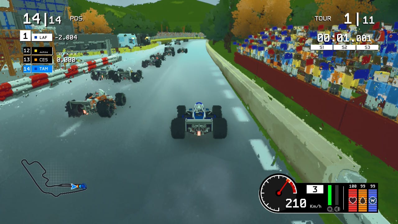 Côté contenu, le titre ne propose pas énormément de modes mais ils semblent relativement suffisants. Il y a le mode carrière durant lequel vous pouvez en profiter pour débloquer de nouveaux pilotes. En parallèle vous pouvez vous adonner au mode libre qui vous permet de concourir à votre guise avec la configuration de votre choix et enfin, un espèce de showroom dans lequel voir les différents pilotes / véhicules ainsi que les conditions de déblocages de ceux qui sont verrouillés. Pour s’axer quelque peu sur l’accessibilité, le titre est quelque peu exigeant et pas facile en soi. De plus, et c’est là que les problèmes commencent, l’IA est un peu trop “brutale”. Sans aller jusqu’à dire qu’elle est agressive, elle a tendance à ne pas s’arrêter même si vous êtes par exemple en travers sur la route. Elle manque parfois de “précision”.