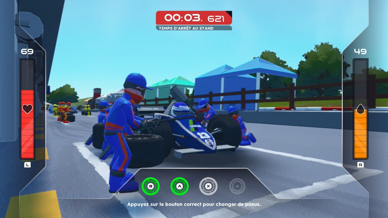 Le titre propose un gameplay plutôt arcade mais s’inspire avec soin des spécificités des monoplaces. Bien évidemment, vous pouvez accélérer et freiner. Toutefois, vous apprendrez assez rapidement que le freinage se doit d’être dosé sous peine de terminer en glissade pour avoir bloqué vos roues. Encore une fois, matériel Switch oblige, les gâchettes ne sont pas adaptatives et ne permettent donc pas de freiner de manière douce. Il conviendra alors de freiner par intermittence et ça passe plutôt bien. Disons que dans un sens, ça nous renvoie aussi à un gameplay très à l’ancienne. Ensuite, à partir d’une certaine génération de monoplaces, vous aurez accès à une technologie spécifique de la formule 1 : le WRS.