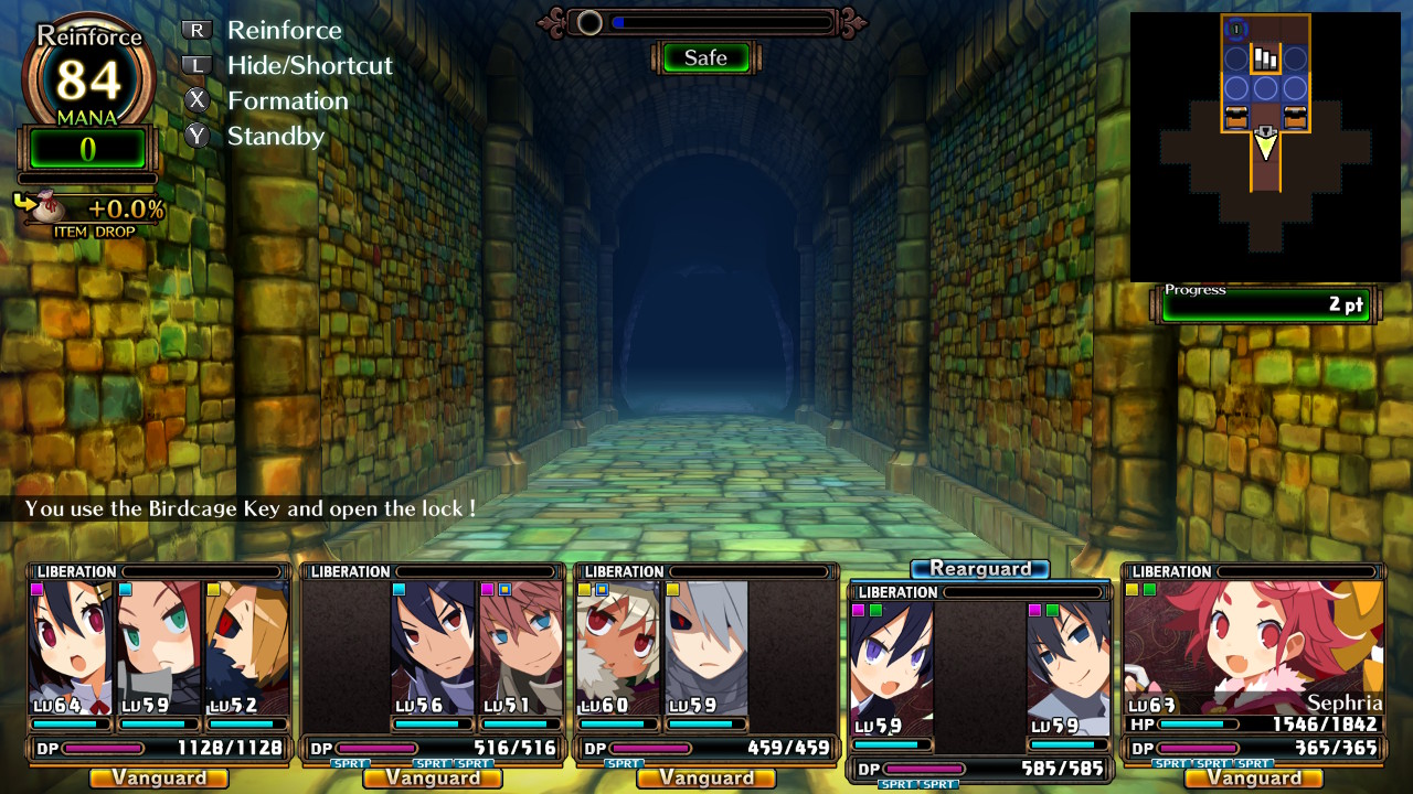 À la différence de Labytinth of Refrain et de son binôme Dronya / Luca, Labyrinth of Galleria propose à mon sens des personnages bien plus attachants. Sans spoiler l’intrigue ni le développement, Euréka qui peut sembler au premier abord à un « clonne » de Flonne dans Disgaea a tout un background qu’il est intéressant de découvrir, à tel point qu’on a parfois envie de rusher un donjon pour voir la suite du scénario. Encore une fois, c’est un large catalogue d’émotions qui nous est offert. Pour ce qui est du style graphique des personnages, on ressent à 100% la patte Disgaea puisque c’est une nouvelle fois Takehito Harada qui est aux commandes pour la création de ces modèles. Concernant les décors, cet opus nous livre des donjons aux ambiances propres, mais qui reposent tout de même sur des bases similaires à coup d’interrupteurs et de couloirs cachés à révéler. Musicalement, les pistes font bien leur travail en donnant un côté un peu mystique à l’exploration des donjons, ainsi qu’aux nombreux discours dans et autour du manoir. Point négatif en revanche la musique dans les donjons n’est pas dynamique. Lorsque l’on plonge sous l’eau, une nouvelle piste plus « aquatique » se lance. Et quand on ressort, la musique d’exploration recommence du début. Ce ne serait pas un problème si dans certains donjons on a tendance à entrer et sortir de l’eau toutes les 2-3 cases.