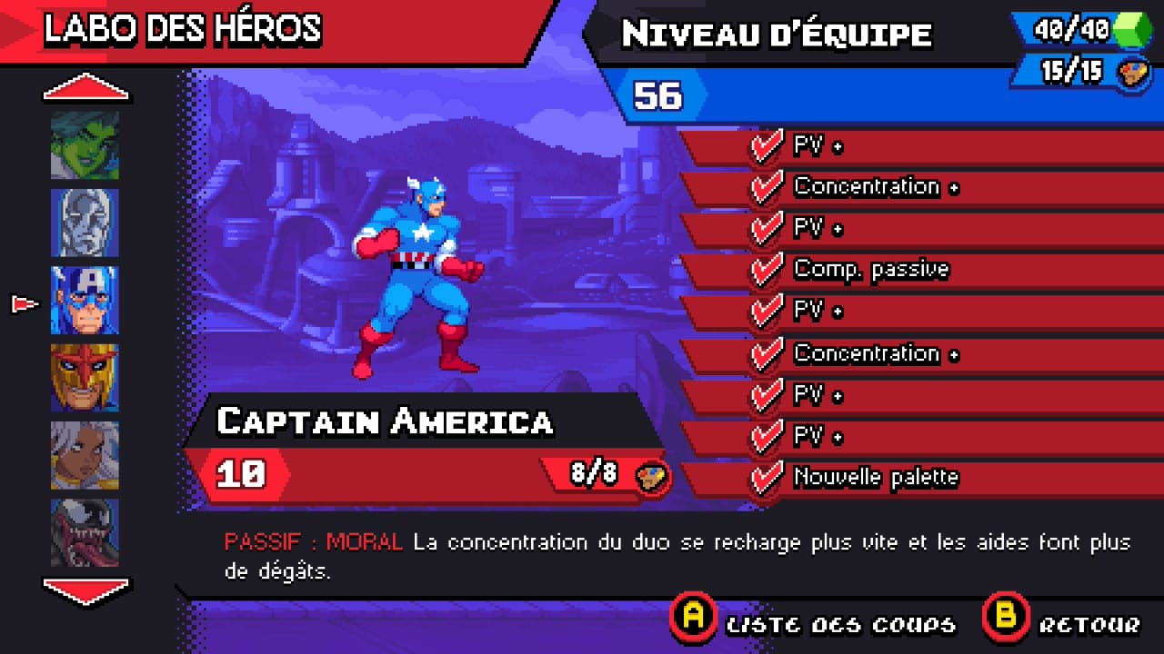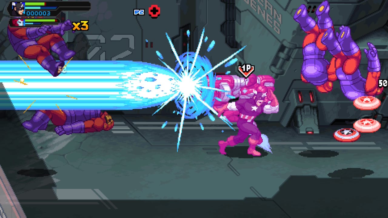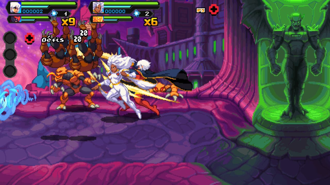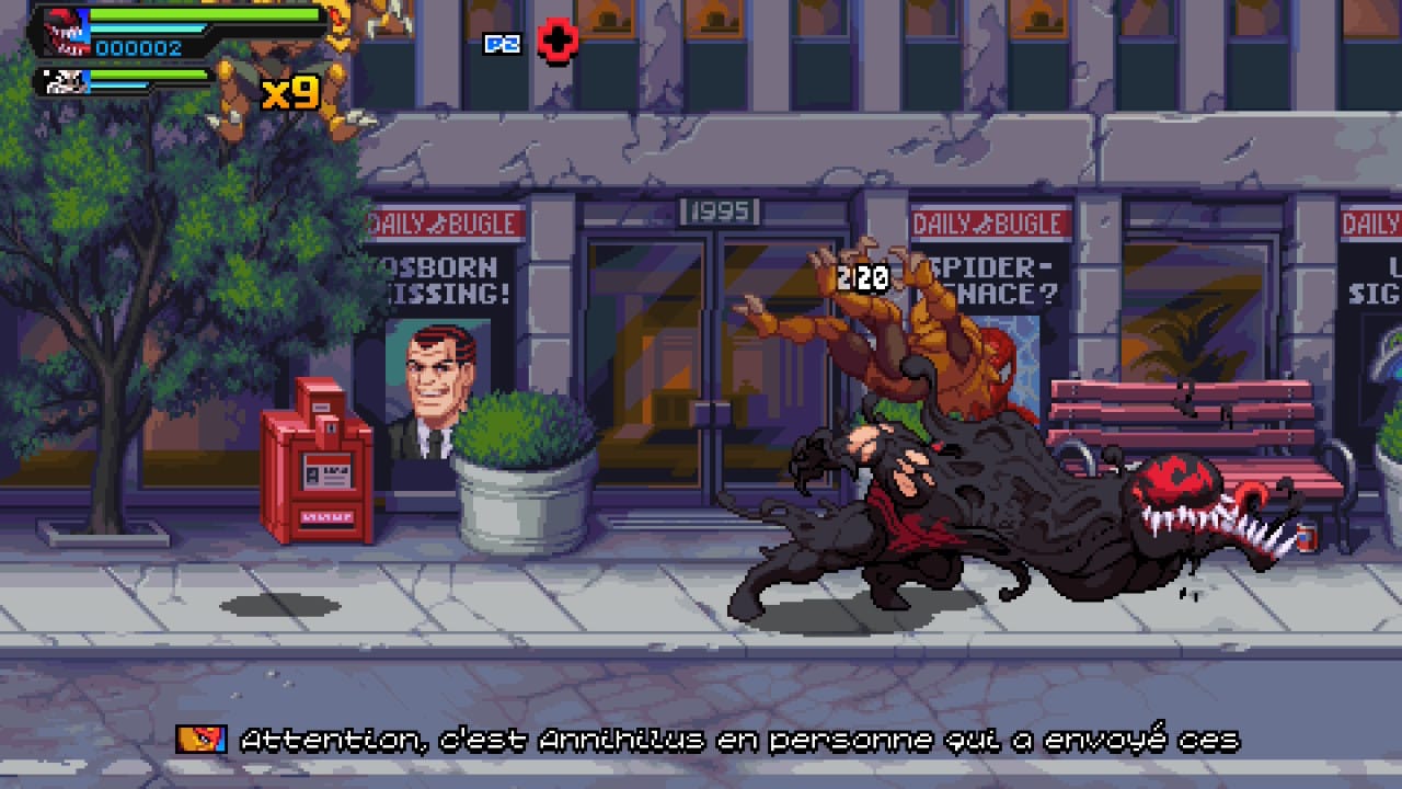 Disons le clairement, le titre se positionne sur du pixel art des années 90 et donc de l’ère Super Nintendo et ça se ressent très vite. Ainsi, il ne faut pas être allergique au rétro pour apprécier le titre. C’est donc une question de goût avant toute autre chose. Malgré tout, la direction artistique est réussie et fidèle aux comics. Le titre tourne bien et les compositions musicales rythmées donnent le ton de la castagne. Il est vrai qu’un peu plus de finesse ne serait pas de refus mais le titre s’en sort malgré tout très bien dans ce style. Il est à noter aussi que les animations sont réussies et ne dénotent pas du tout. Bien au contraire. Le seul point regrettable est peut-être au niveau de certaines hit box un peu bancales (mais ça reste anecdotique).