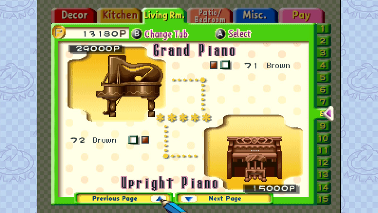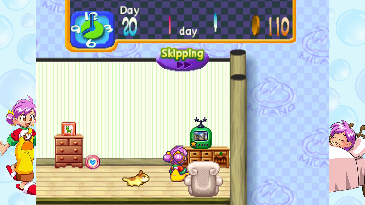 Une journée type se découpe ainsi : déplacement en ville, choix d’une activité (travail ou détente), retour à la maison de l’oncle pour vaquer à ses occupations, puis coucher. L’aspect gestion reste très minimaliste : pas de faim, pas d’hygiène, rien de ce genre. À la maison, vous pouvez effectuer jusqu’à deux activités : ménage, lessive, cuisine, etc. En accomplissant certaines actions, Milano obtient des points de Skill, Mood et Energy. Ces statistiques servent à débloquer les minijeux, tandis que la Skill permet d’accéder aux difficultés supérieures.