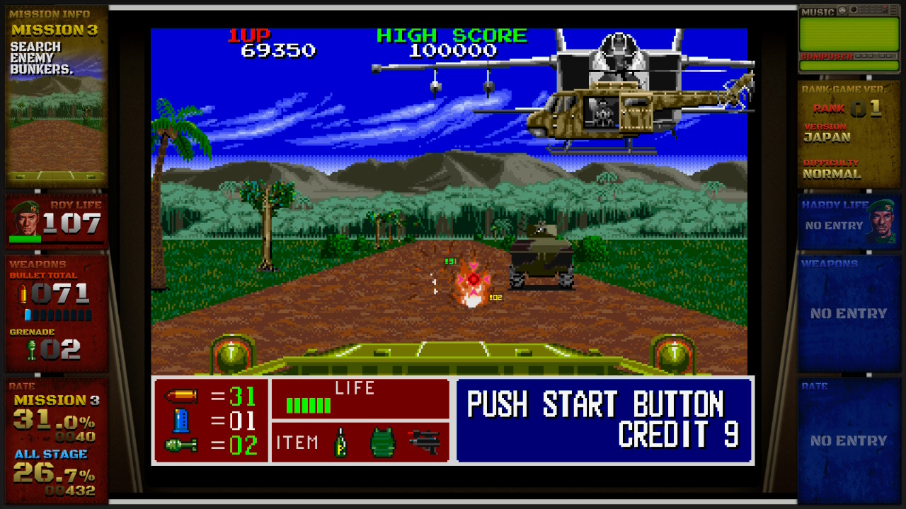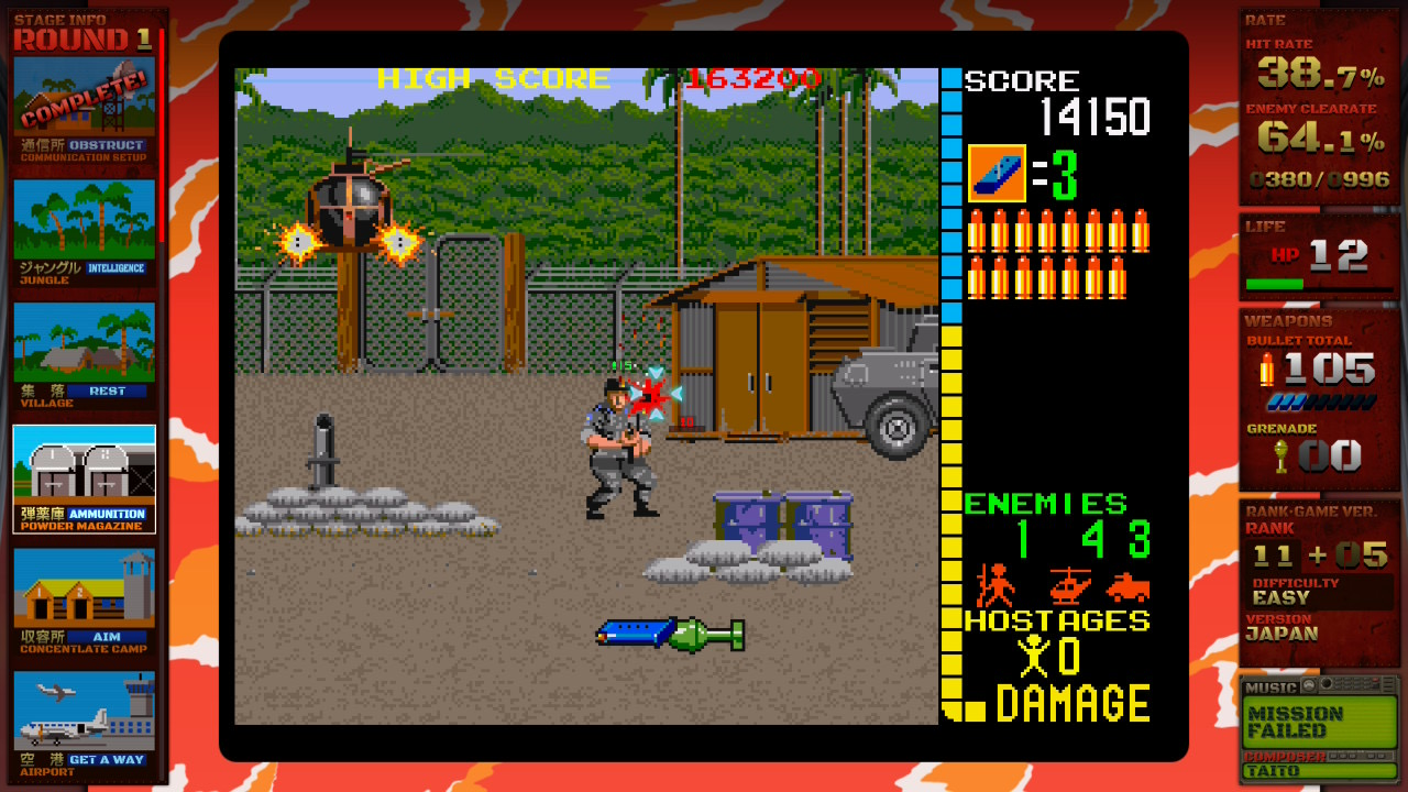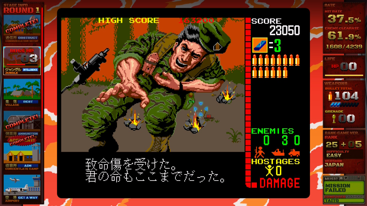 Sur le plan de la jouabilité, les rails shooters classiques comme Operation Wolf ou Thunderbolt conservent une prise en main intuitive et plaisante. La visée via le Joy-Con fonctionne bien et la précision est correcte, même si une dérive occasionnelle peut survenir. Un bouton permet de recalibrer rapidement le réticule, ce qui évite la frustration. Le plaisir de jeu reste donc intact et permet de retrouver les sensations des salles d’arcade, tout en profitant du confort moderne d'une bonne vieille banquette et d'une télé. À l’inverse, Night Striker pose problème. Les commandes du véhicule sont trop sensibles, et l’absence de réticule rend la visée approximative. Les déplacements rapides du vaisseau, combinés à la nécessité d’éviter les obstacles, transforment parfois l’expérience en corvée plus qu’en divertissement. De plus, la tenue du Joy-Con à la verticale pour ce jeu n’est pas la plus ergonomique et peut fatiguer à la longue. C’est clairement le maillon faible de la compilation en termes de jouabilité, et donc de fun même si son système d’embranchements reste original et rafraîchissant. Chaque jeu propose plusieurs versions (japonaises et anglaises), ainsi que des options de difficulté pour tous les niveaux, mais même en facile, les jeux demeurent très durs... Heureusement, les crédits virtuels illimités permettent d’aller au bout des jeux malgré tout, ce qui les rend accessibles même aux joueurs les moins aguerris. On apprécie également la possibilité de jouer en coopération locale dans Operation Thunderbolt et Space Gun, un vrai plus pour retrouver l’esprit convivial des bornes d’arcade à deux.