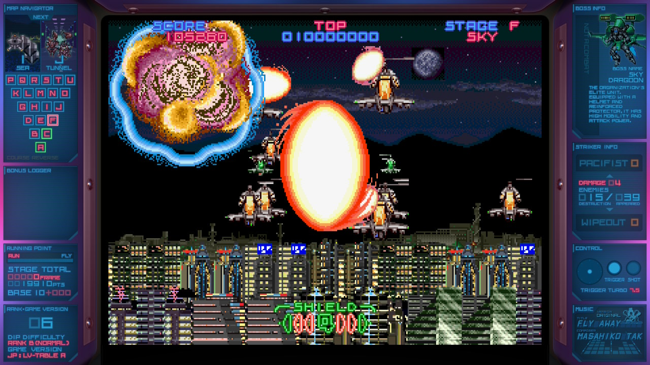Le troisième jeu, Night Striker, tranche radicalement avec les deux premiers. Sorti en 1989, il propose une expérience hybride qui combine des éléments de Space Harrier et d’Out Run. Ici, le joueur pilote un véhicule volant futuriste à travers des environnements urbains et futuriste, avec un système d’embranchements qui permet de choisir différents chemins à la fin de chaque niveau. Cette structure donne au jeu une rejouabilité importante et une identité unique. Cependant, ses contrôles sont très sensibles et l’absence de réticule de visée rendent la prise en main compliquée, ce qui risque de décourager rapidement les plus jeunes d'entre nous.