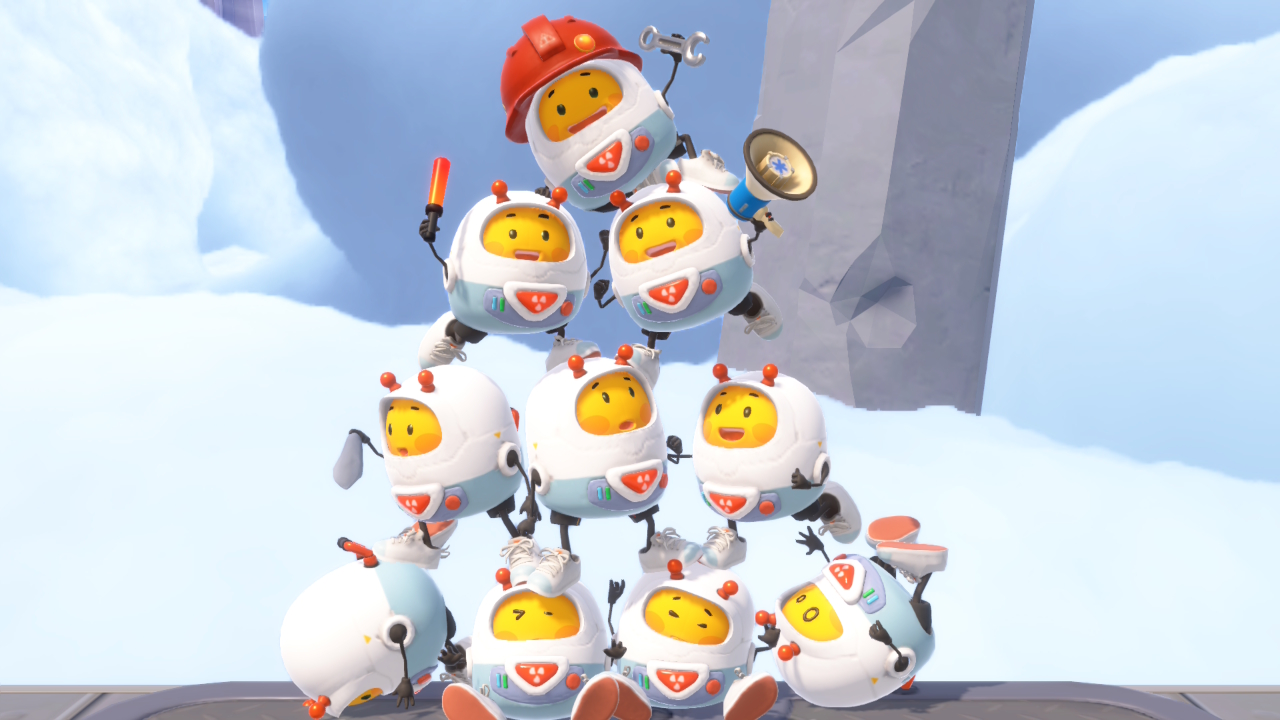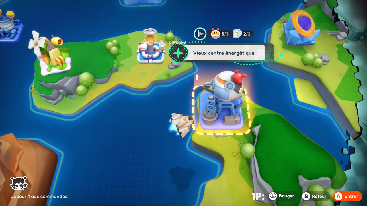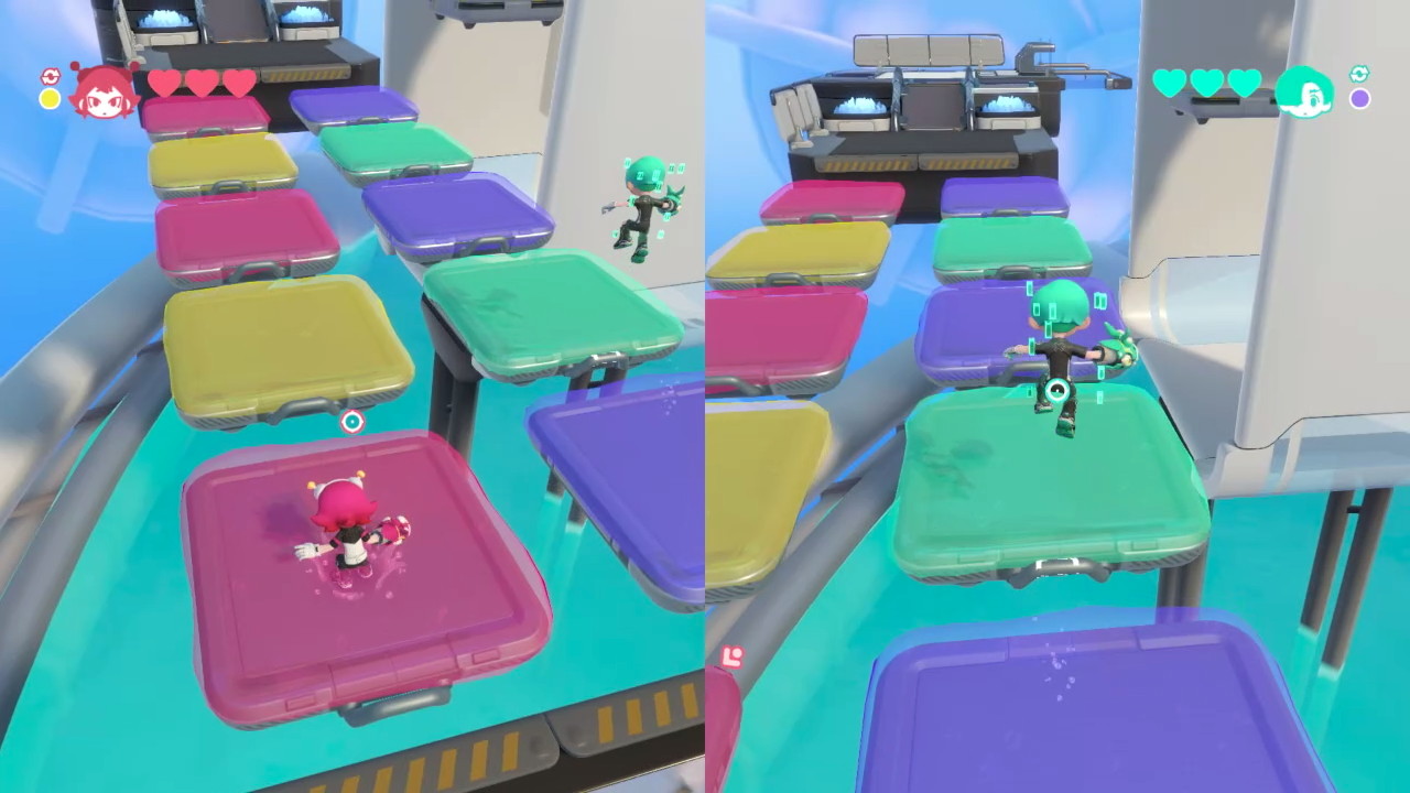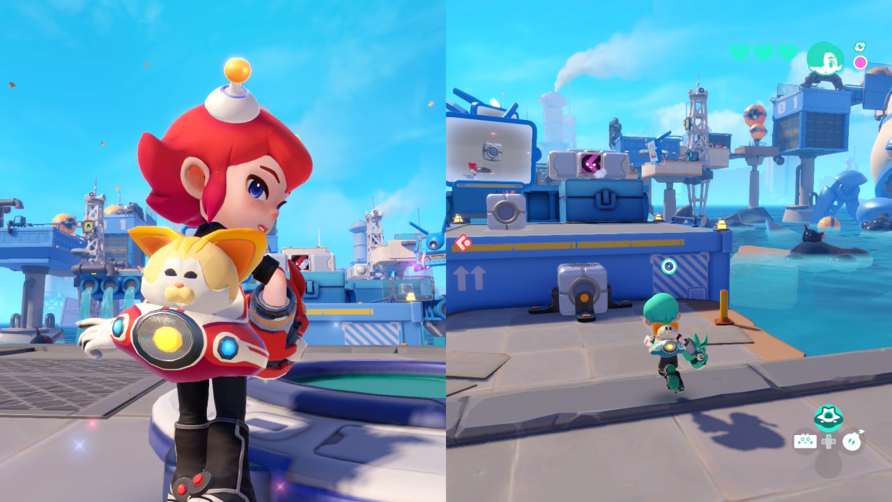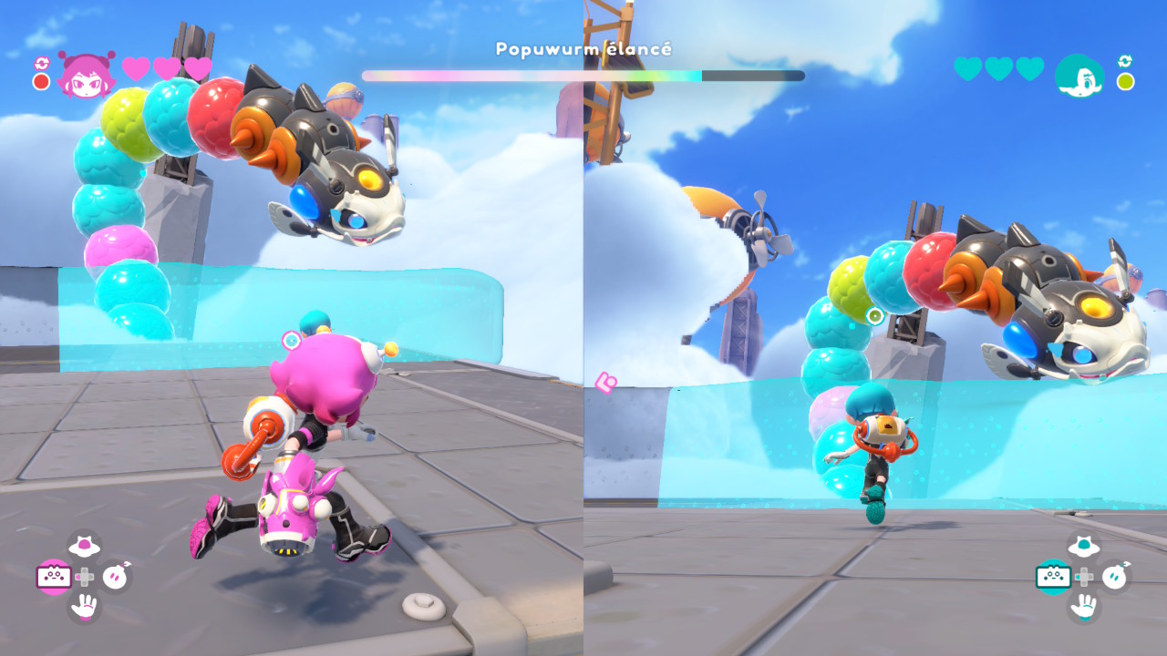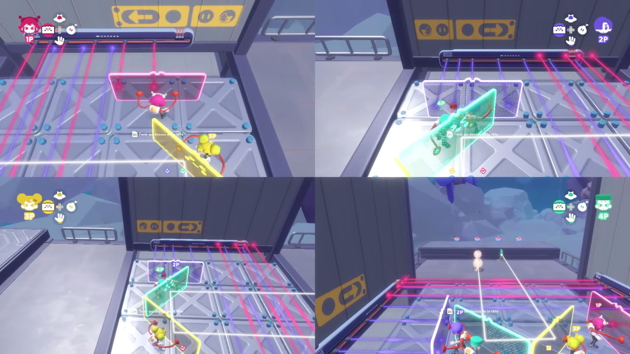 Le jeu est fluide et le level design est complètement arrangé autour du jeu en coopération, que ce soit sur le mode histoire ou fête, tout est fait pour que les joueurs communiquent et se serrent les coudes pour arriver au bout. Les niveaux sont ainsi linéaires et délimités par différents parcours avec des mécaniques précises pour traverser les plateformes du niveau. Durant les sessions de jeu, il est possible de rencontrer quelques bugs bénins, notamment sur certains sauts de plateformes mouvantes, qui empêchent le personnage de monter l’obstacle en face. Plus rarement, il peut arriver de rencontrer des défauts de caméra, qui part dans d’autres sens ou zoom sur le personnage sans raison valable, mais cela s’estompe en sortant de l’endroit où cela se passe. Sur certaines situations, il peut arriver que les textes se passent tout seul sans que l’on ait forcément le temps de lire ce qui nous est communiqué. Fait étonnant, les interactions en jeu avec les personnages non joueurs se font avec la touche Y, c’est assez inhabituel mais ne pose pas de réel problème pour suivre le jeu. En termes de contenu, le vaisseau nous sert de hub central donnant sur diverses missions dans des environnements colorés en 3D. Grâce à Gambol, le marchand du vaisseau, il est aussi possible de personnaliser l’apparence de son personnage grâce à sa boutique.