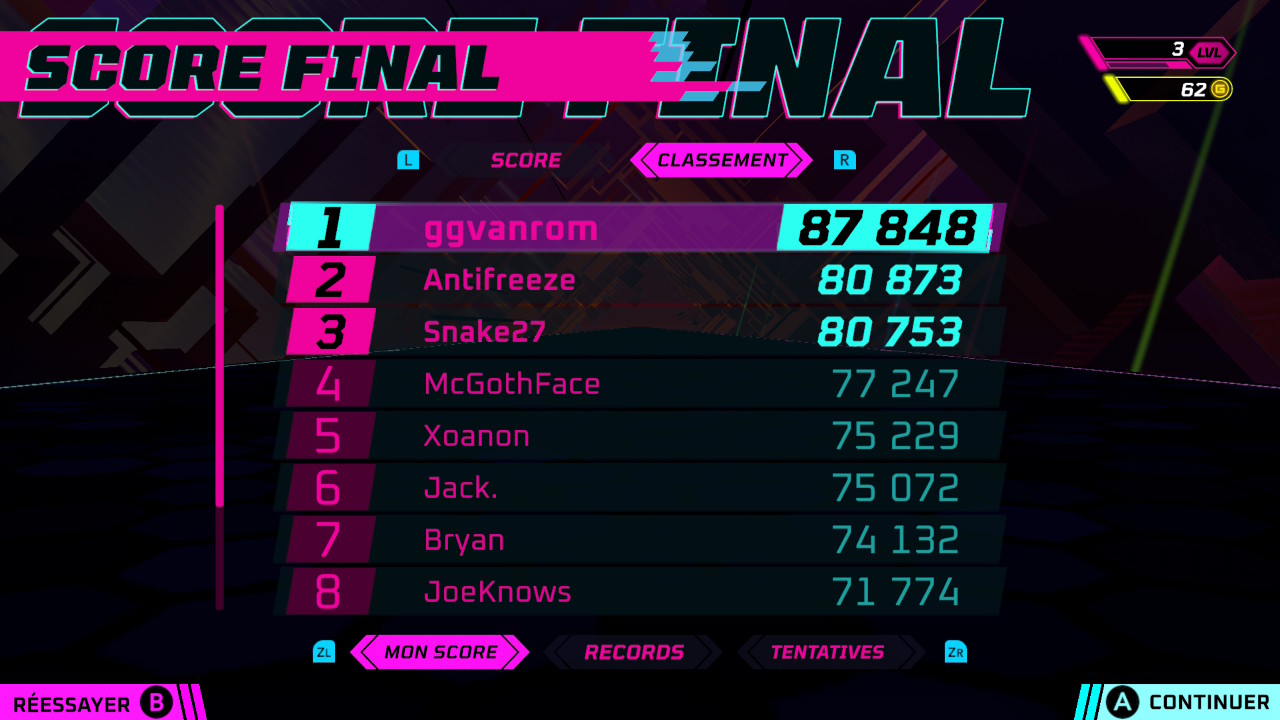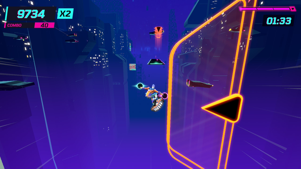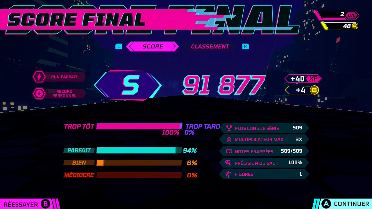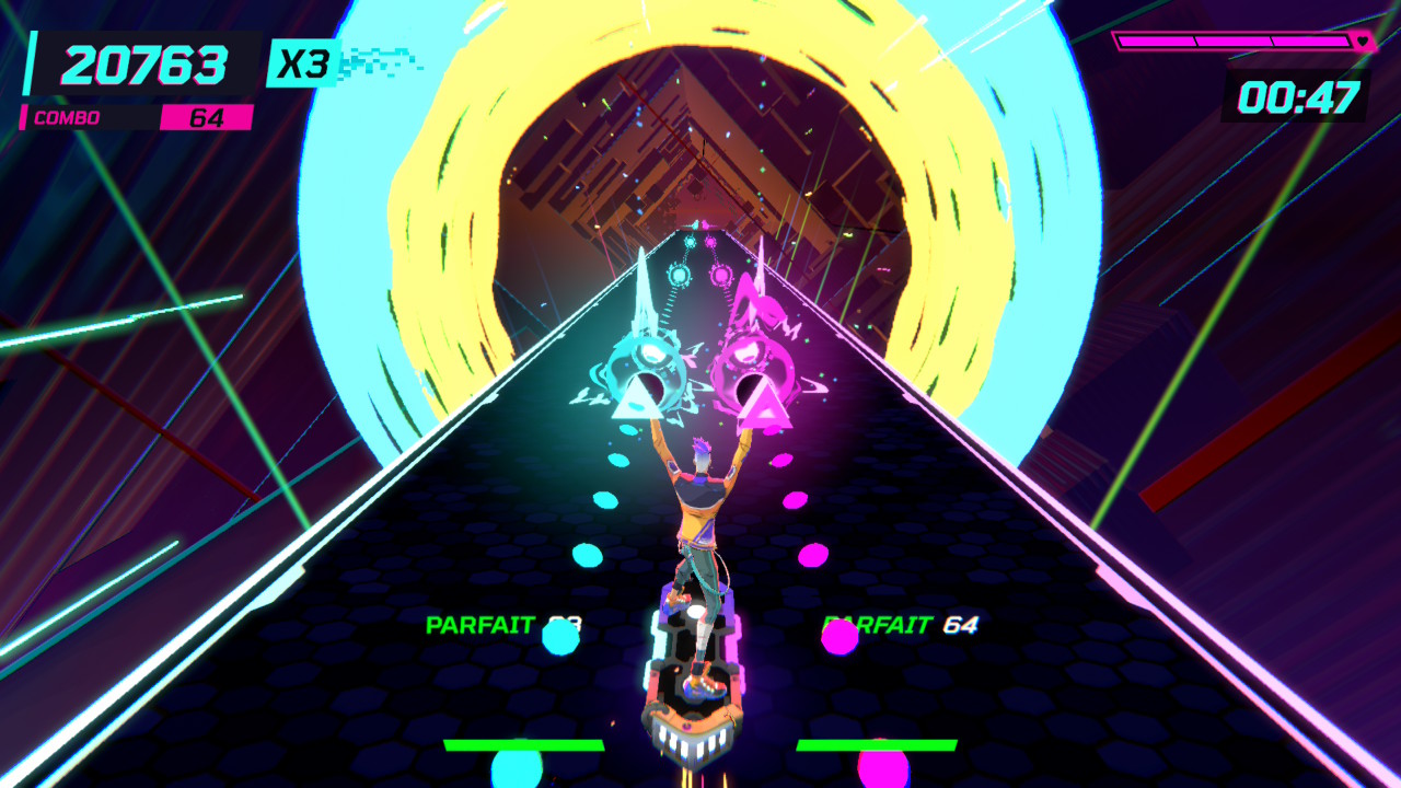 Chaque musique propose trois modes de difficulté. Une fois la piste terminée, votre score total est calculé en fonction de votre niveau de précision. La meilleure note est bien sûr l’habituelle note S. Vous gagnez également des points d’XP pour augmenter votre niveau de joueur, ainsi que de l’or servant à acheter de nouveaux cosmétiques pour vos héros. Côté bande-son, celle-ci est essentiellement inspirée de la synthwave. Si vous souhaitez un peu plus de diversité, des DLC sont proposés à l’achat, mais à des tarifs qui piquent quelque peu : 7,99 € pour des packs de cinq musiques et 10,99 € pour ceux de sept morceaux. Mais si la jouabilité est au rendez-vous, pourquoi se priver ?