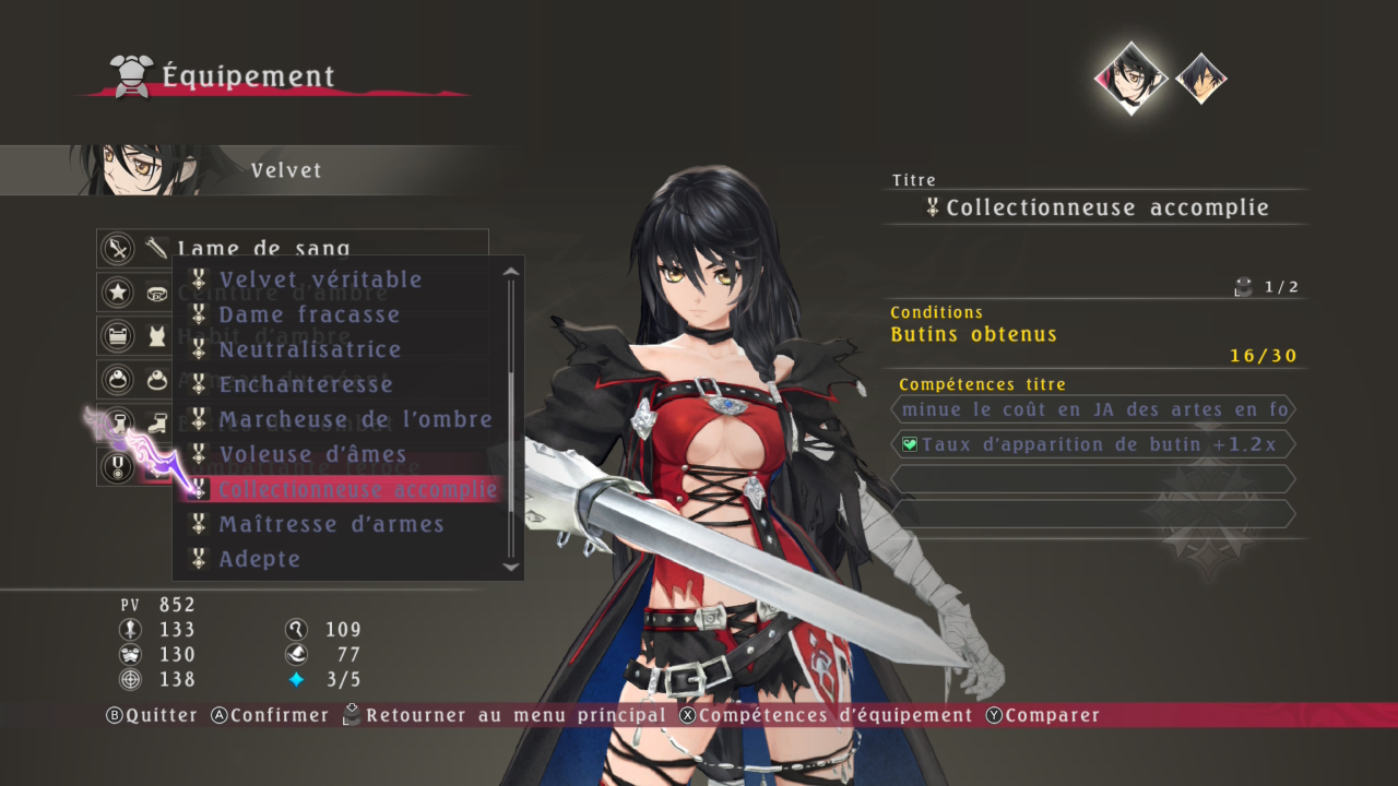 D’ailleurs, les systèmes en place fonctionnent très bien, et vous récompensent toujours pour votre temps de jeu. Entre les titres à gagner avec vos prouesses, qui boostent vos stats, et les équipements à démonter pour en renforcer d’autres, ce qui récompense le fait de tuer des ennemis, il est rare de s’ennuyer ! Et vu que bien combattre vous rapporte plus de récompenses, vous êtes encouragés à rester attentif pour faire avancer la machine ! Tales of oblige, les combats ne sont pas au tour par tour mais bien une affaire d’action où vous pouvoir attaquer, former vos propres combos, enclencher un mode rage ou même changer de personnage à la volée pour des affrontements dynamiques, s’ils sont un peu brouillons vus de l’extérieur. Mais force est de constater que la souplesse du système de combos, basé sur une jauge qui se vide quand vous attaquez mais qui peut-être remplie instantanément en tuant des ennemis, et pouvant être personnalisée même en plein combat, nous donne toujours de quoi faire ! Et le tout est bien expliqué lors de tutoriels parsemés lors des premières heures de jeu, histoire de ne pas avoir trop d’informations d’emblée.